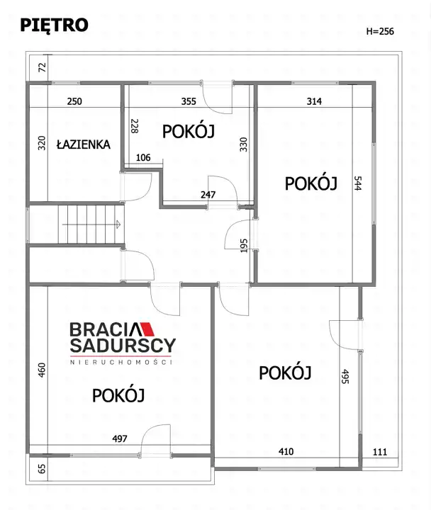 Na piętrze znajdują się 4 pokoje (22,85 m2, 17,08 m2, 20,3 m2, 10,57 m2 ), łazienka (8,0 m2) oraz przedpokój.