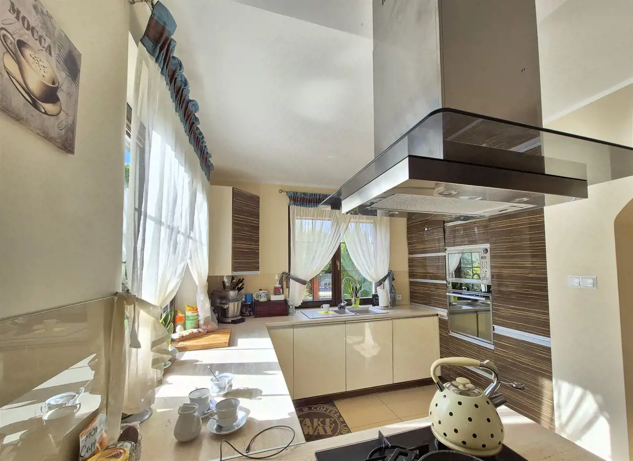 Dom doskonale zaprojektowano i perfekcyjnie wykonano z wykorzystaniem bardzo wysokiej jakości materiałów budowlanych. W budynku zainstalowano energooszczędne okna z drewna a także profesjonalnie wykonano termoizolację co zapewni niskie koszty eksploatacji. Na dachu zainstalowano kolektory słoneczne oraz dwa systemy grzewcze : kominek z płaszczem wodnym oraz kocioł gazowy .