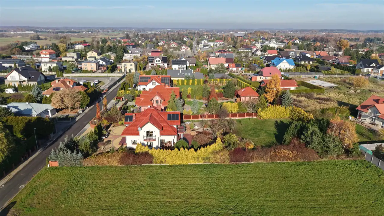 Ogród przydomowy wypielęgnowany z nasadzonymi ozdobnymi drzewami i krzewami i oczkiem wodnym. Na całym terenie zainstalowano podziemny system nawadniania i zraszania roślinności. Ogrodzenie posesji wykonano z cegły klinkierowej z ozdobnymi kutymi elementami .