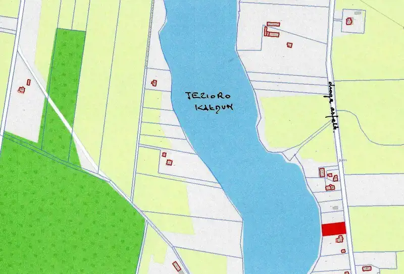 - Kształtna działka o pow. 1500m2 położ. nad jeziorem Kałdun o pow. ~24 ha. Nachylona ku tafli jeziora, ogrodzona i zagospodarowana. Działka z drzewami i krzewami ozdobnymi oraz owocowymi. Znajdują się na niej także wiata garażowa oraz niewielki murowany budynek gospodarczy z mediami i WC.