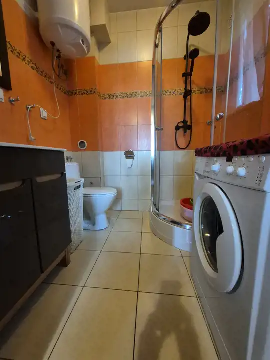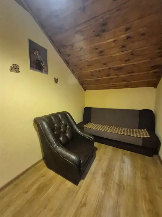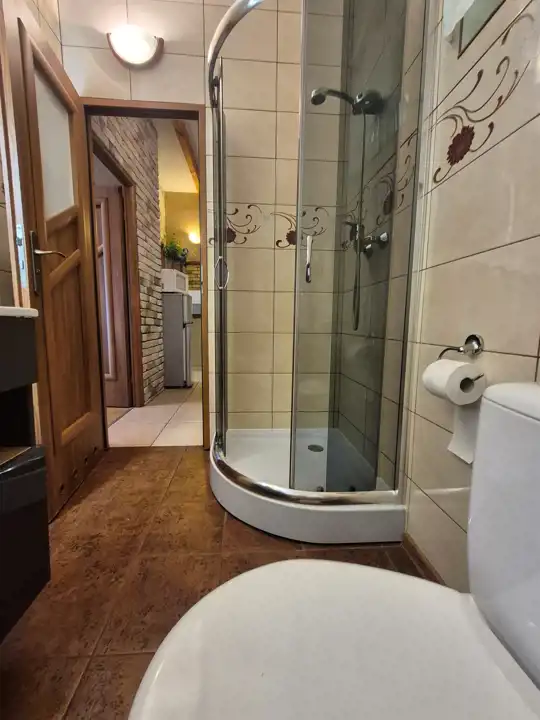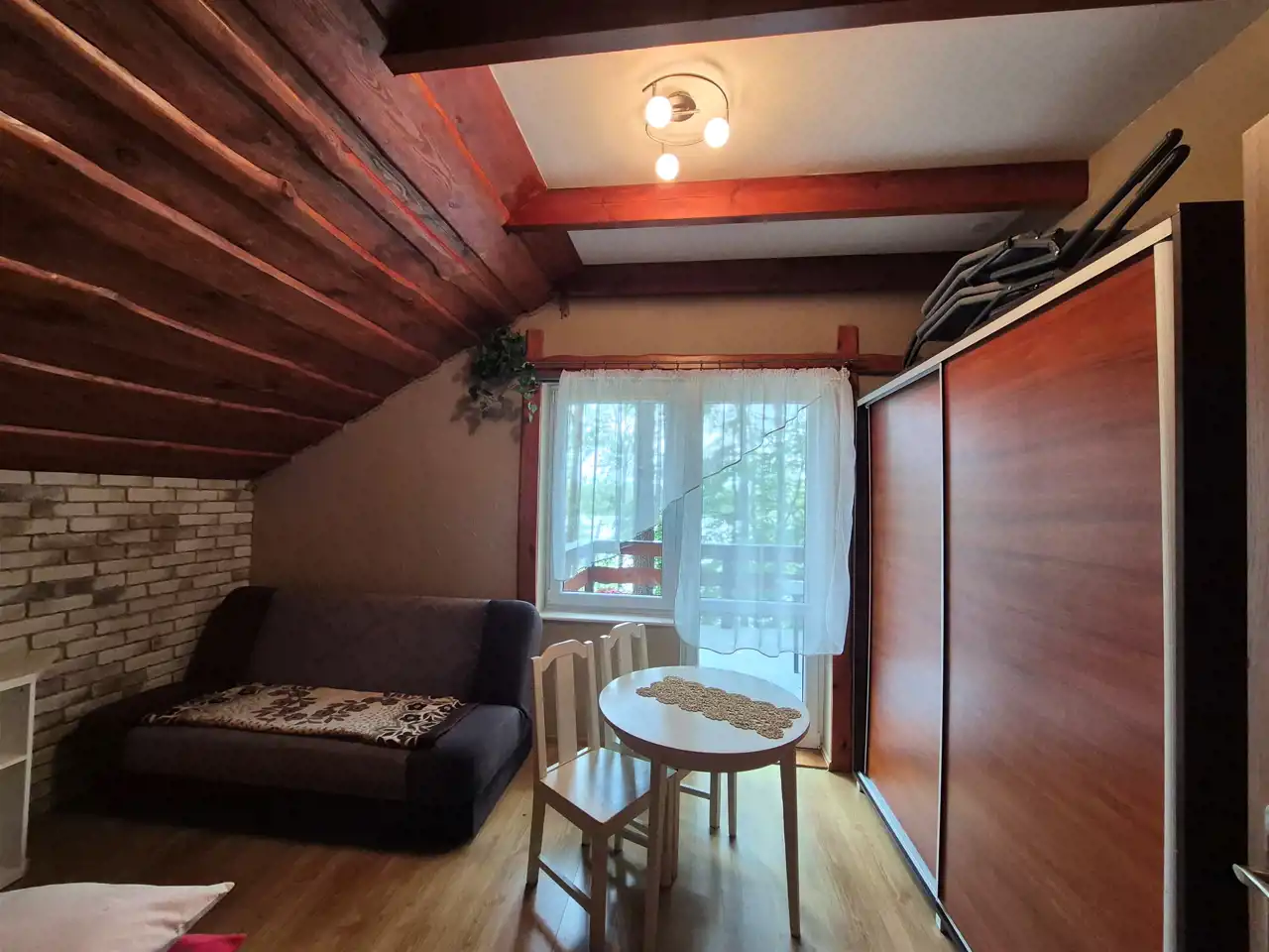Piętro domu z oddzielnym wejściem to trzy sypialnie, duży taras ( 21 m2) z widokiem na jezioro, kuchnia, łazienka z kabiną prysznicową.
