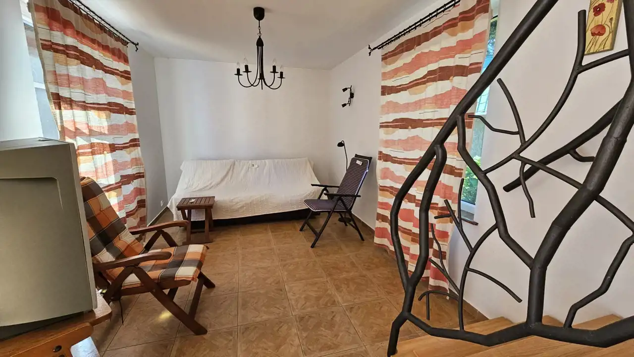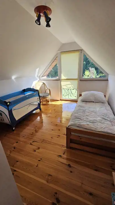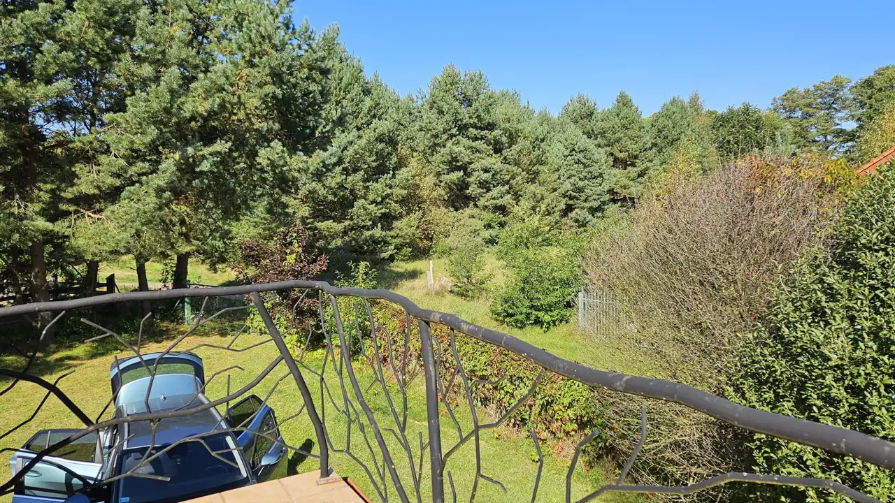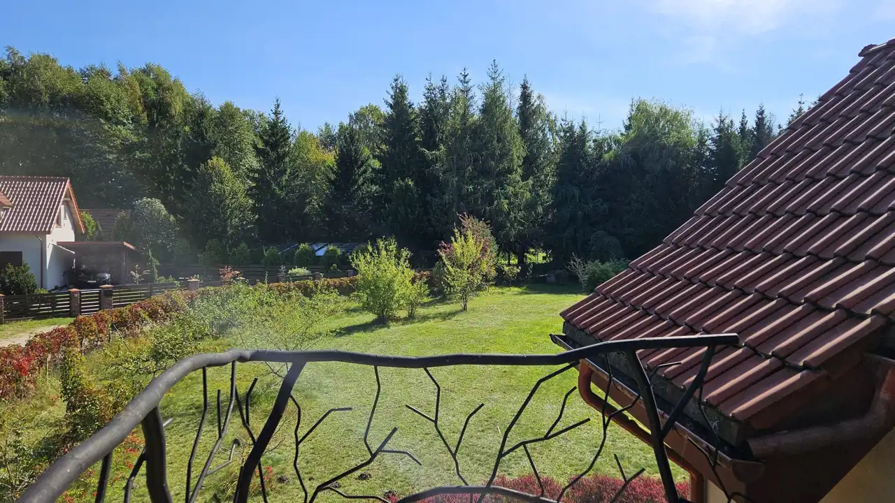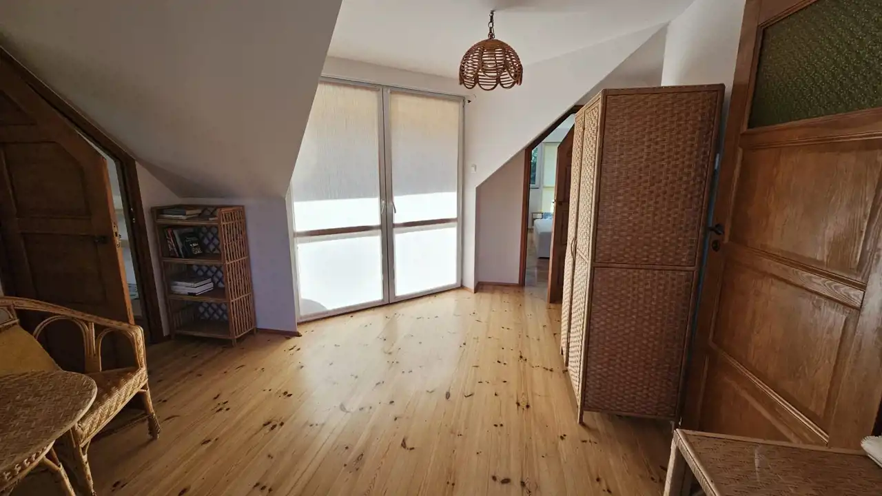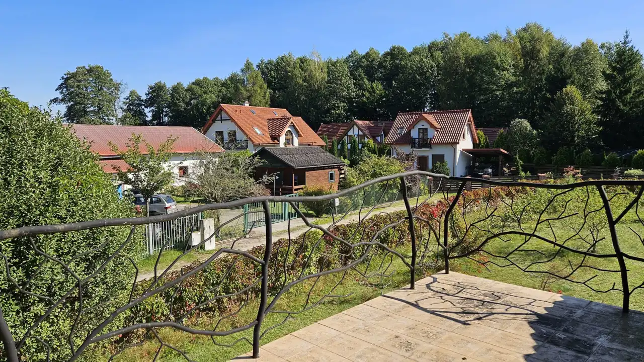 - poddasze - korytarz z wyjściem na otwarty taras z widokiem na jezioro oraz na zadaszony taras od strony ogrodu, łazienka z wc i wanną, dwie sypialnie. W budynku na uwagę zasługują dobrze wykonane i utrzymane podłogi z litej deski oraz balustrady wykonane w technice metaloplastyki.