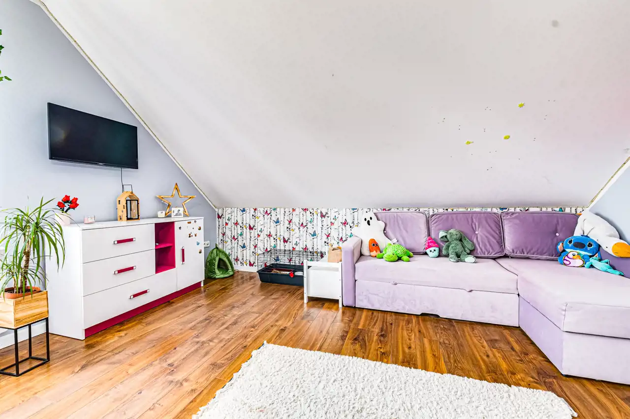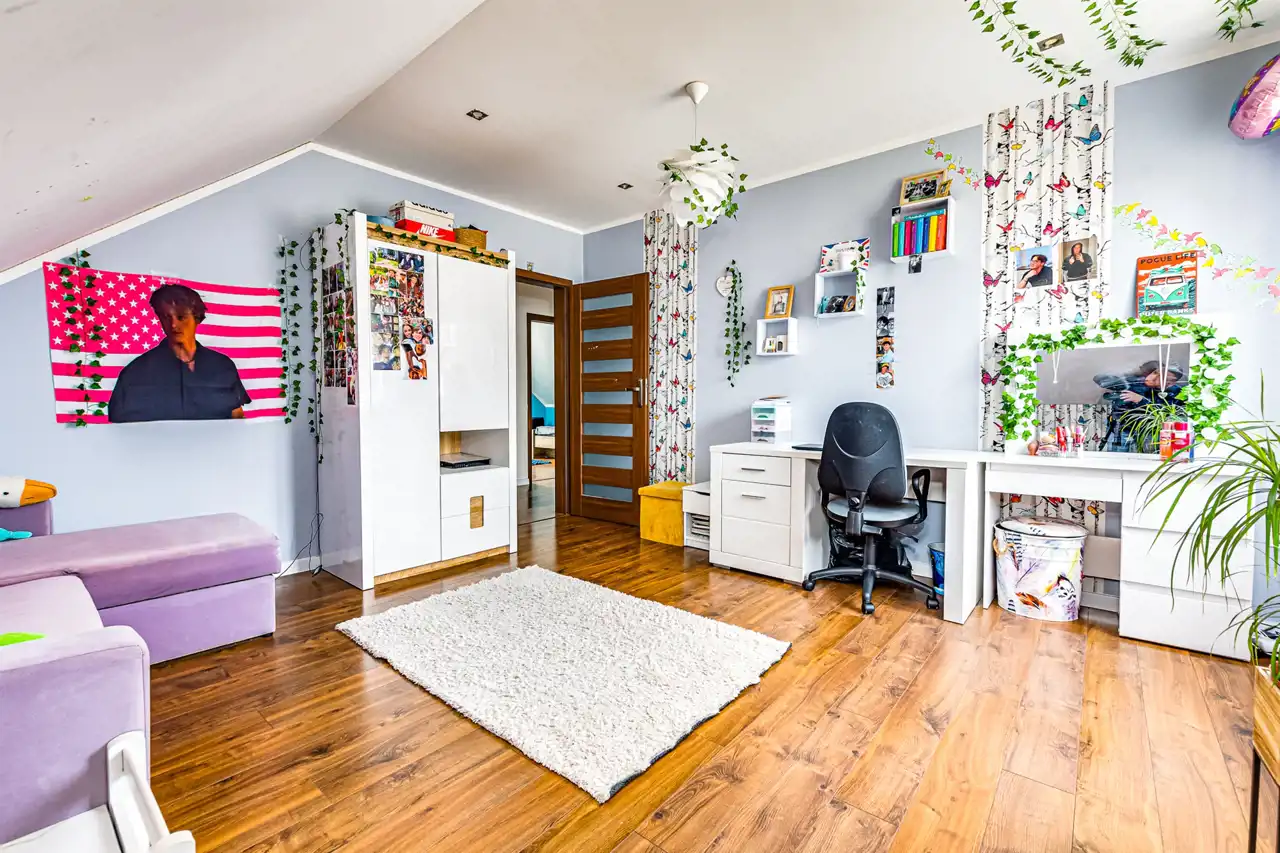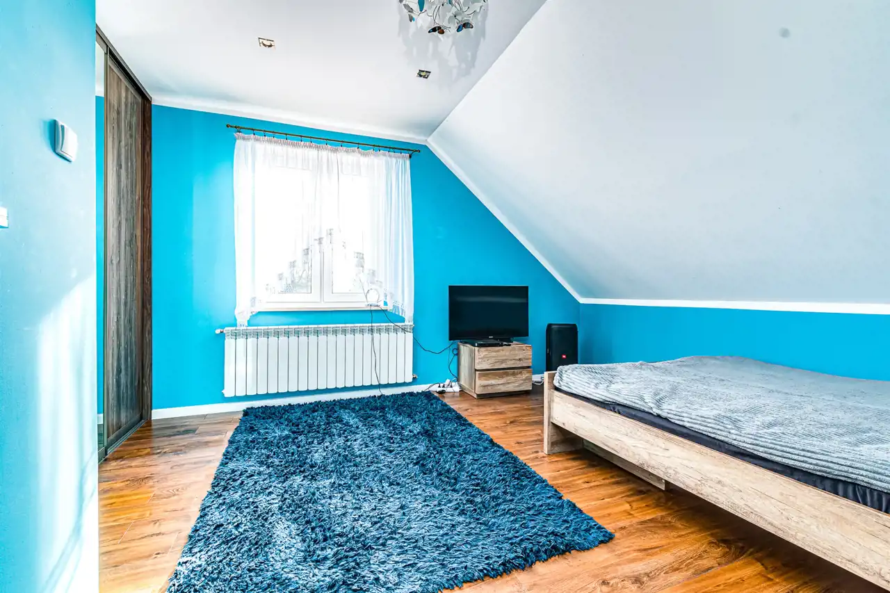 Na poddaszu czekają na nas trzy przytulne sypialnie, które są idealnym miejscem do odpoczynku i relaksu. Każda z nich ma swój unikalny charakter, a duża łazienka z wanną i prysznicem oraz garderoba dodają funkcjonalności temu przestronnemu domowi.