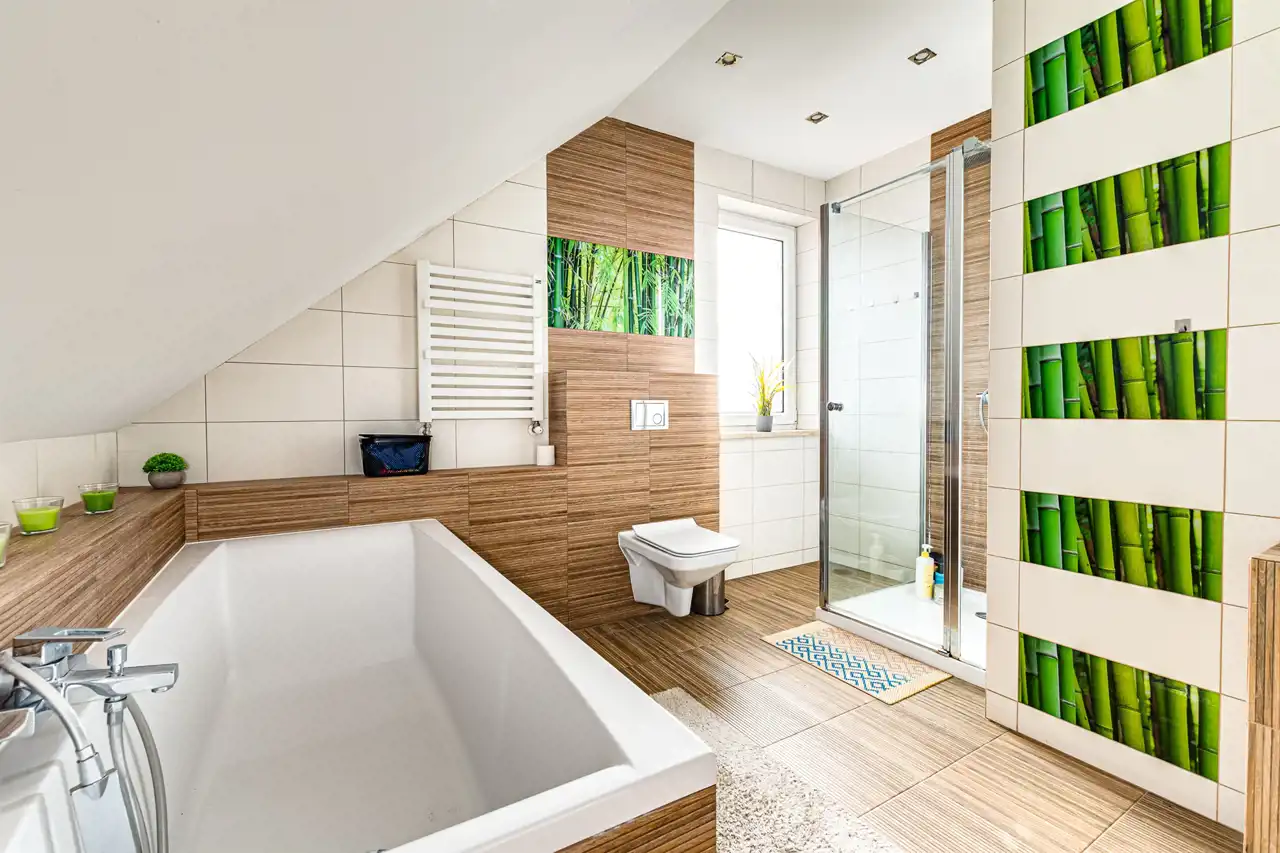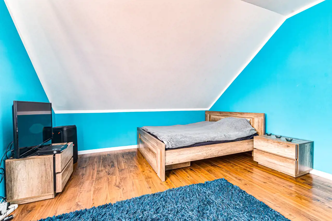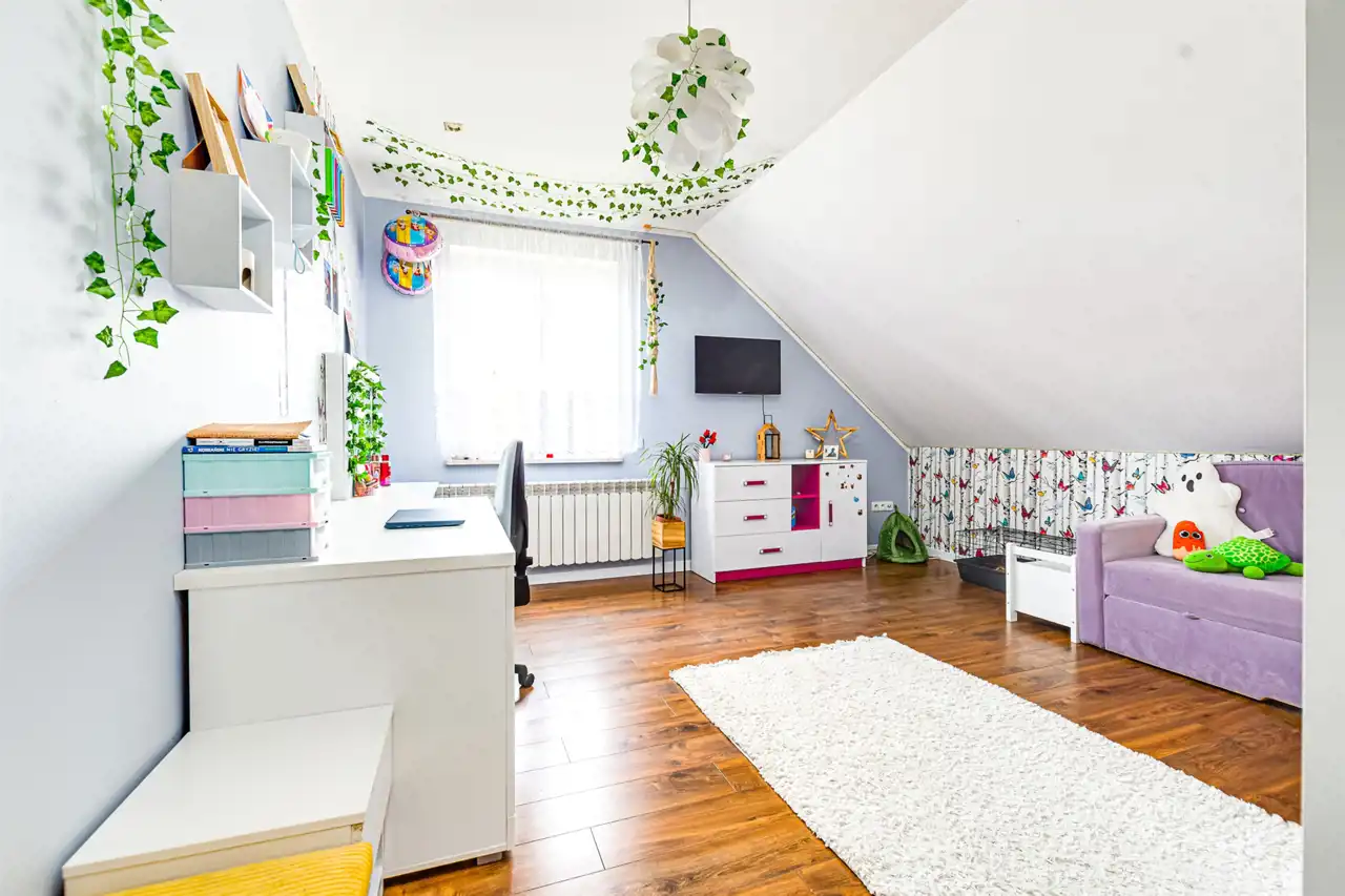 Na poddaszu czekają na nas trzy przytulne sypialnie, które są idealnym miejscem do odpoczynku i relaksu. Każda z nich ma swój unikalny charakter, a duża łazienka z wanną i prysznicem oraz garderoba dodają funkcjonalności temu przestronnemu domowi.