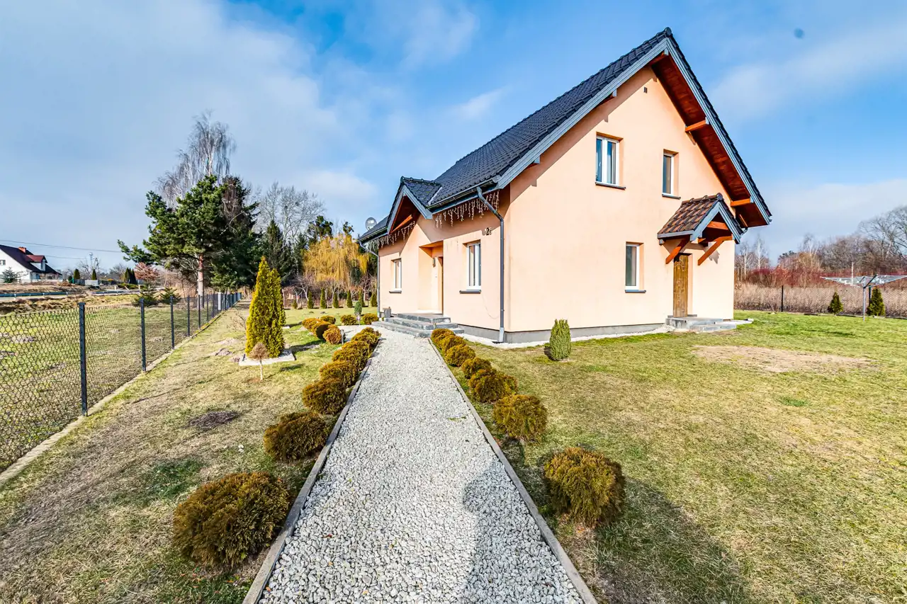 Dom usytuowany w spokojnej okolicy, idealnej dla rodziny z dziećmi oraz osób szukających wytchnienia od miejskiego zgiełku, wśród innych zabudowanych działek i łąk.