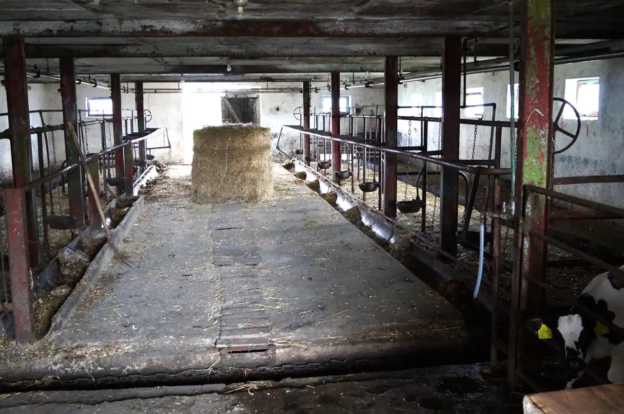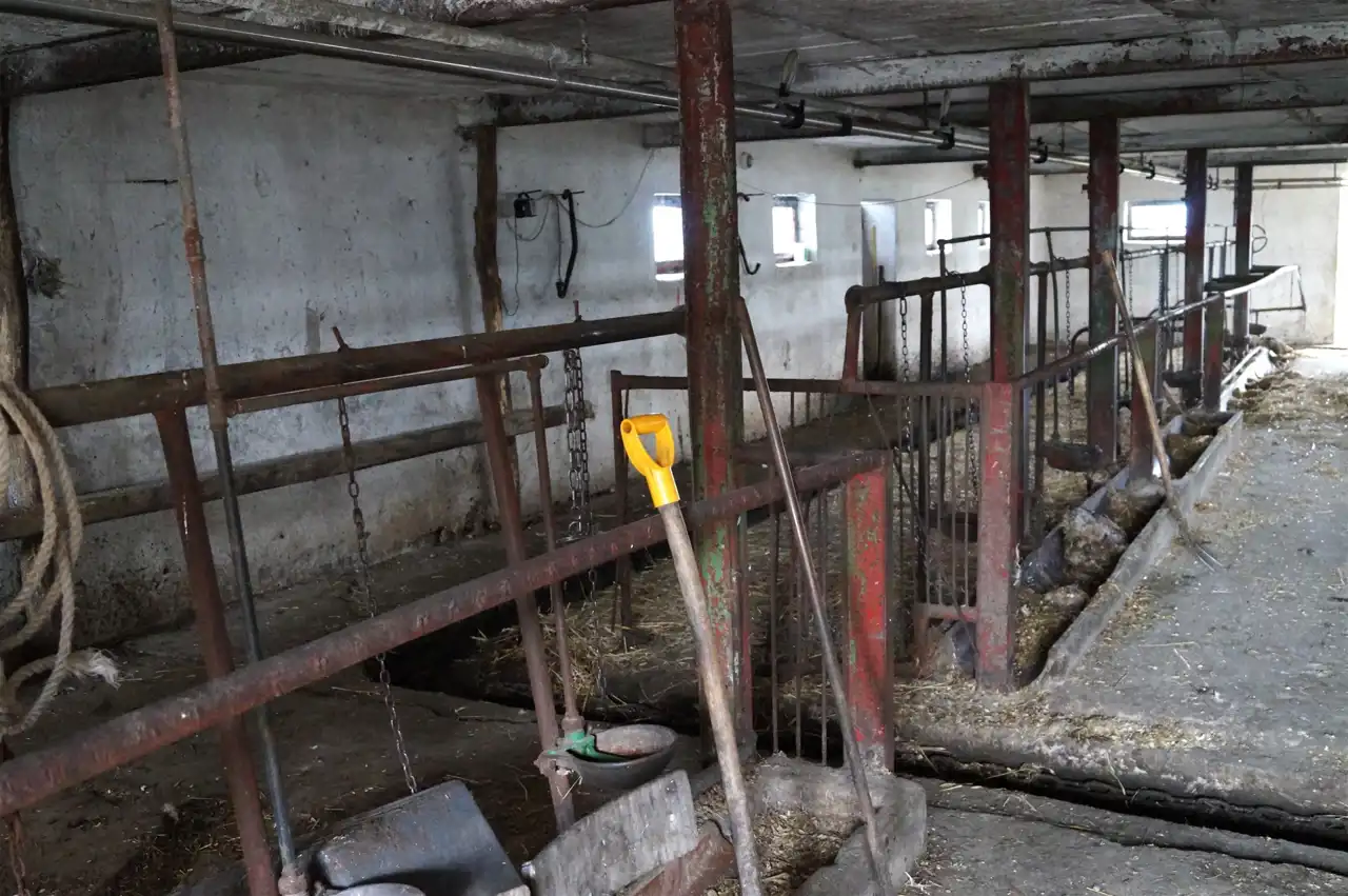 - Obora murowana z dachem krytym eternitem i stanowiskiem na około 30 krów + miejsce na cielętnik oraz zbiornik na mleko z dojarkami elektrycznymi. Za oborą betonowa płyta gnojownika z wyciągarką mechaniczną.