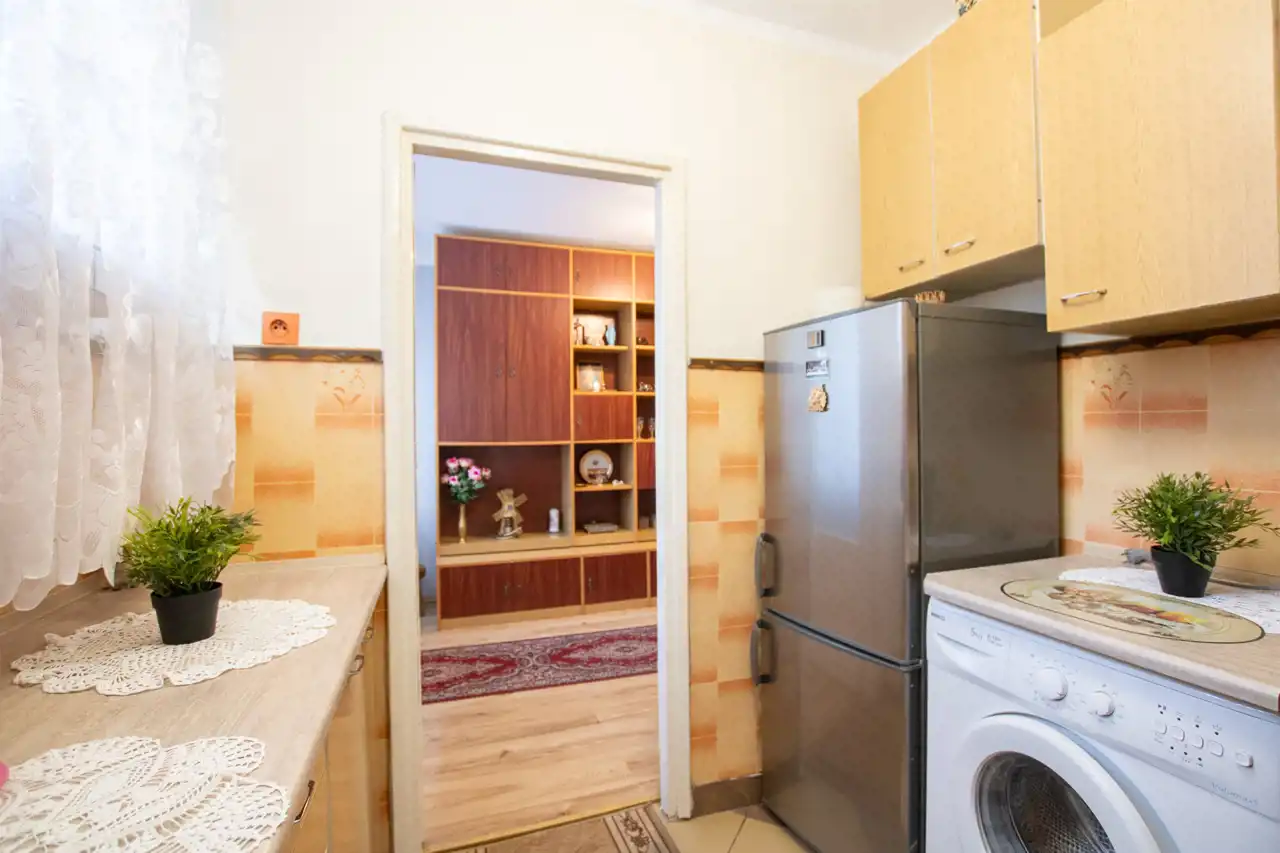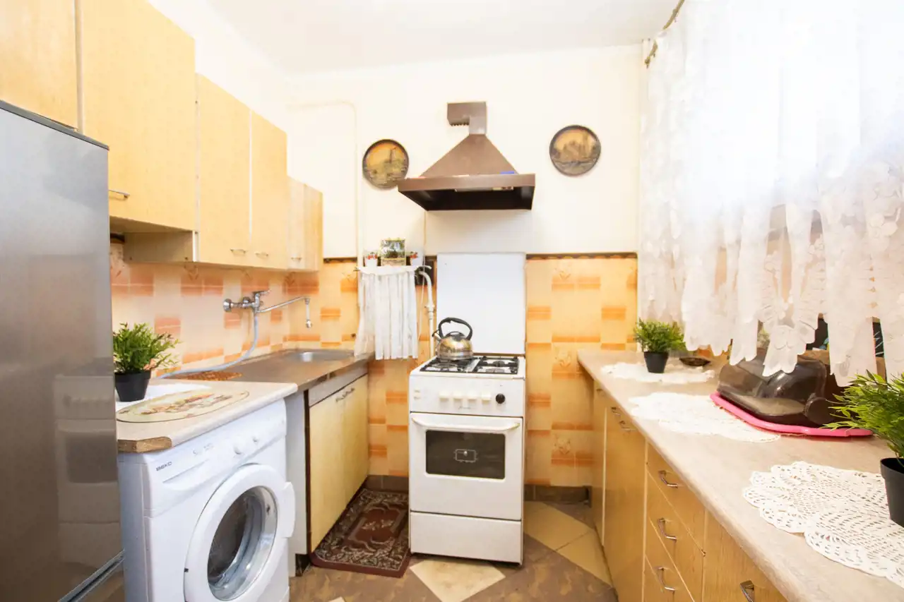 - Kuchnia: jasna, z oknem, kuchenką gazową, lodówką i pralką