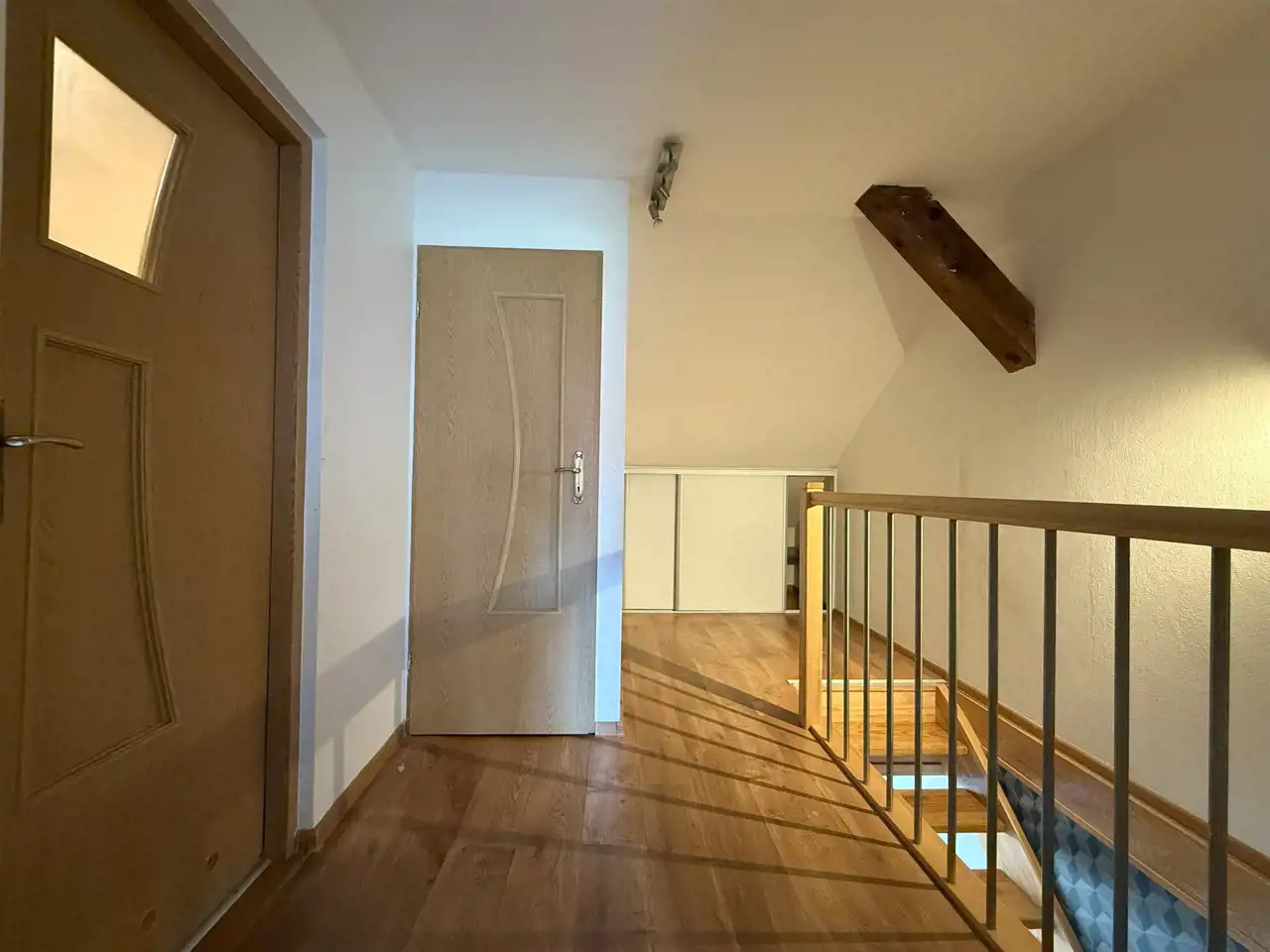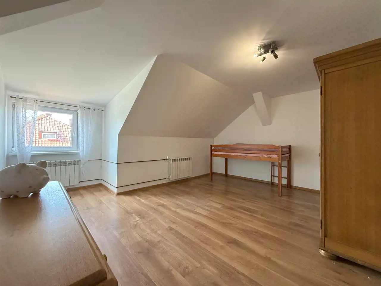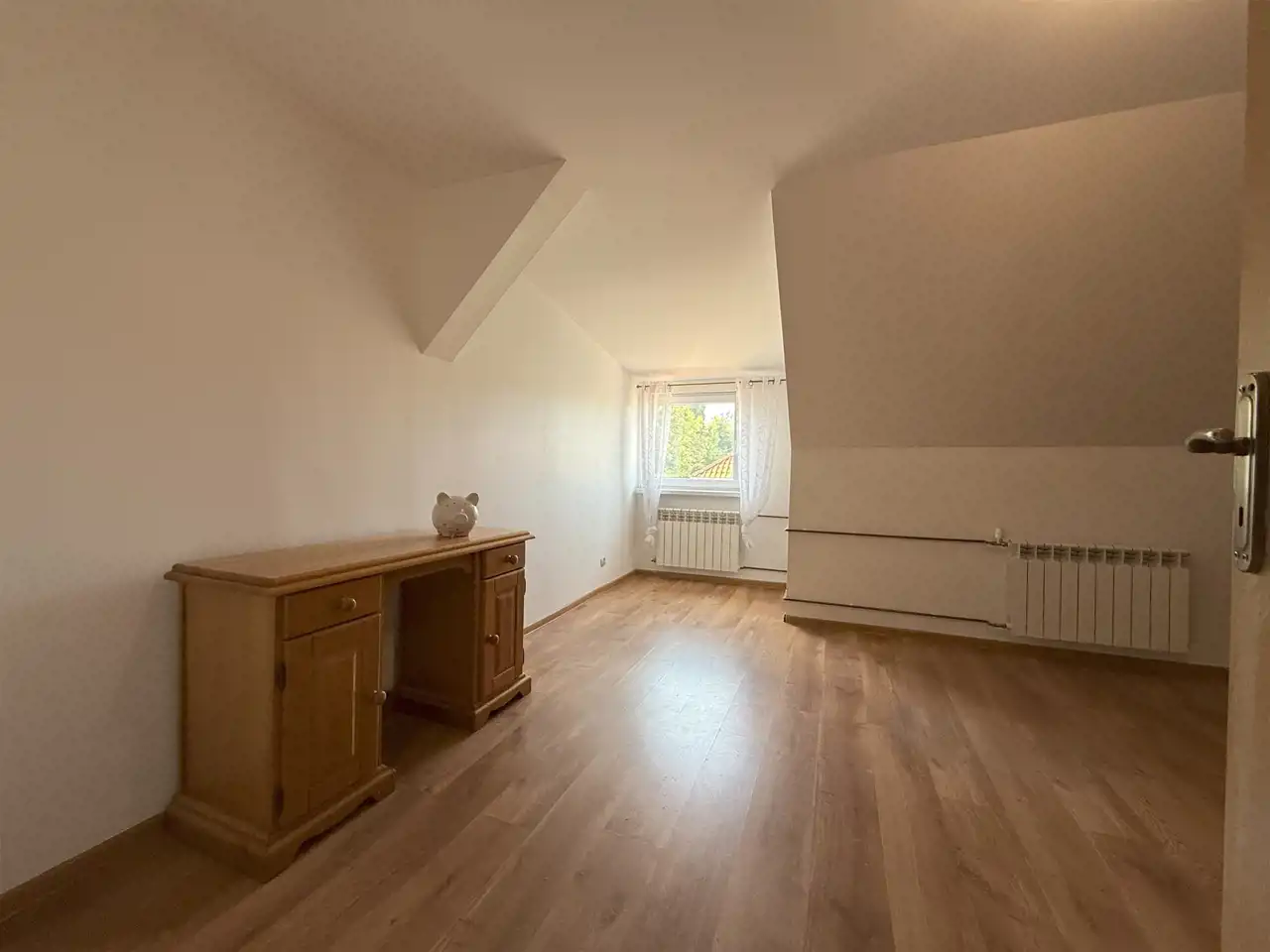 Na piętrze: dwa pokoje oraz zaadaptowany strych pełniący funkcję mieszkalną – to idealna przestrzeń na sypialnię, pracownię lub pokój dla dziecka.