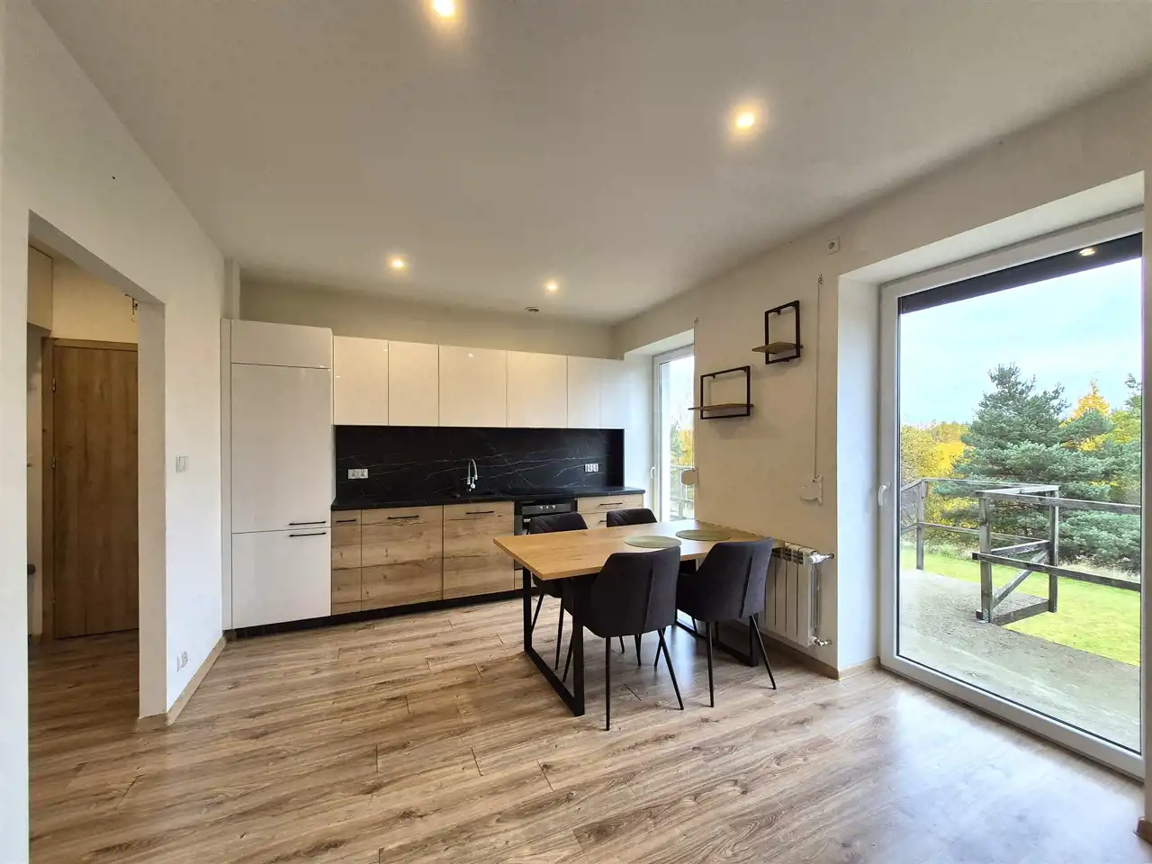 Aneks kuchenny wyposażony w pełną zabudowę oraz sprzęt AGD - lodówka, płyta indukcyjna, piekarnik, pochłaniacz, zmywarka, stół, krzesła .