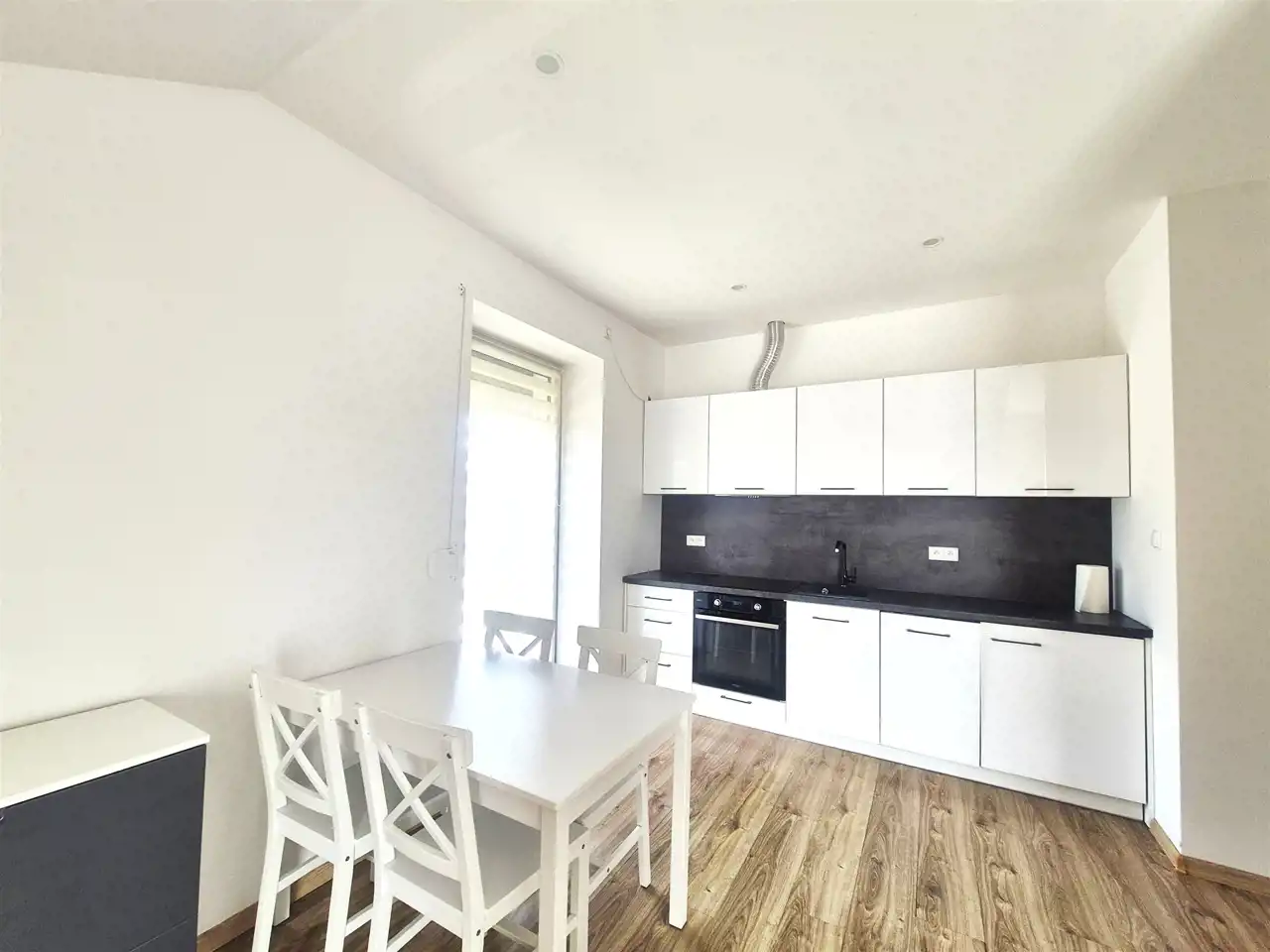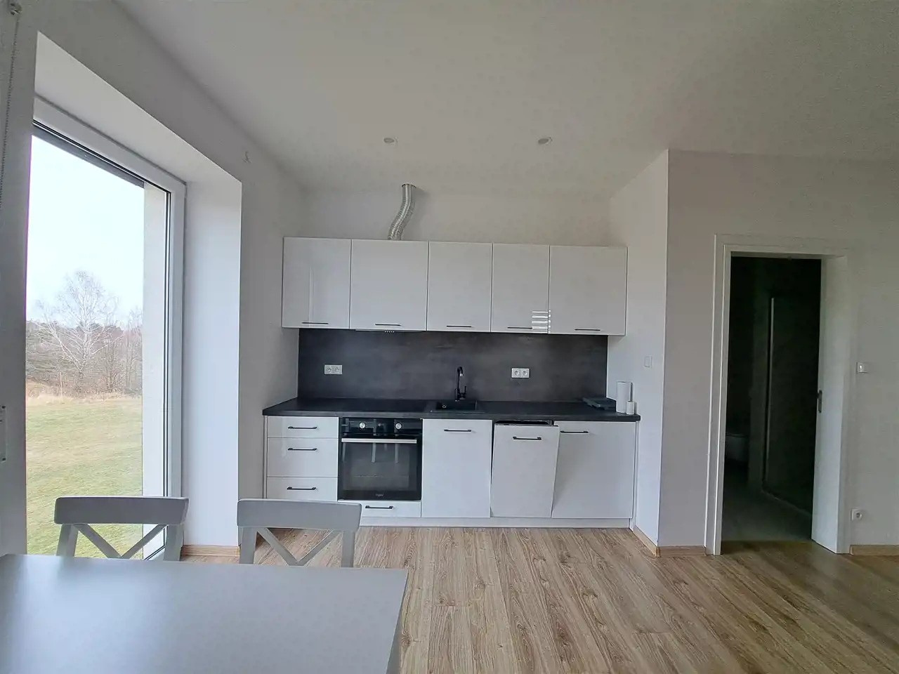 Aneks kuchenny wyposażony w pełną zabudowę oraz sprzęt AGD - lodówka, płyta indukcyjna, piekarnik, pochłaniacz, zmywarka, stół, krzesła .