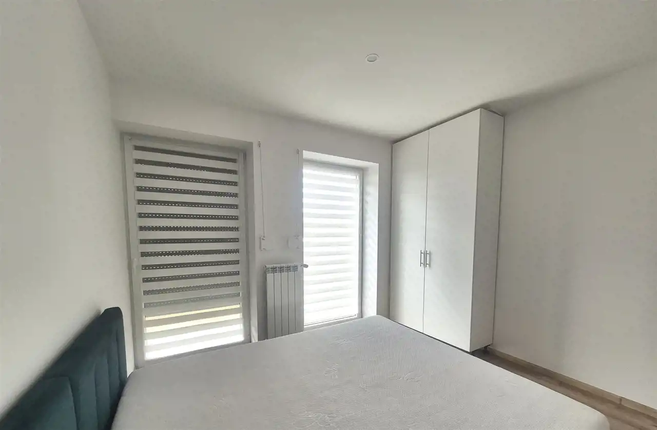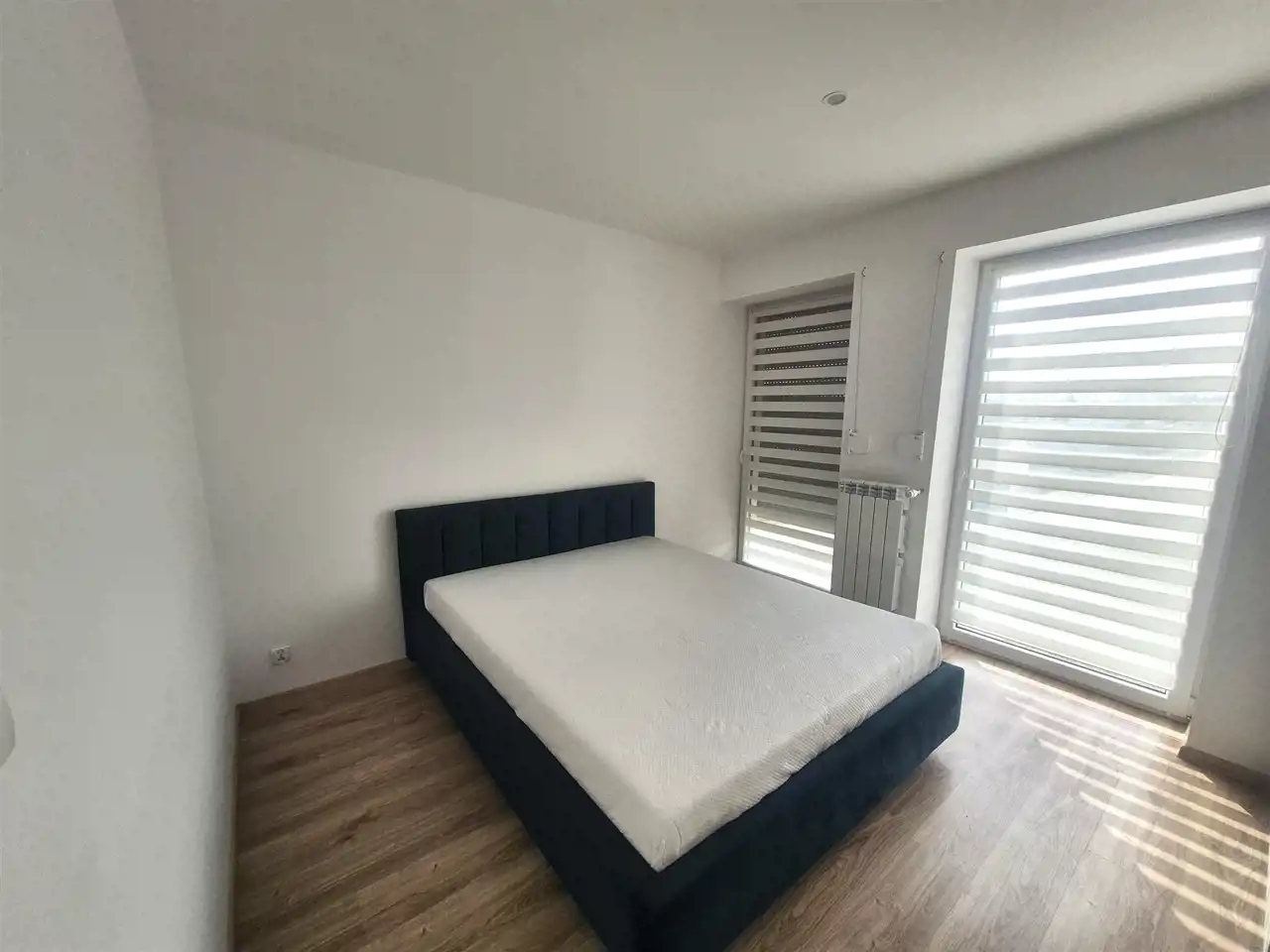 Sypialnia z dużym oknem balkonowym wyposażona w podwójne łóżko sypialniane oraz szafę na garderobę.