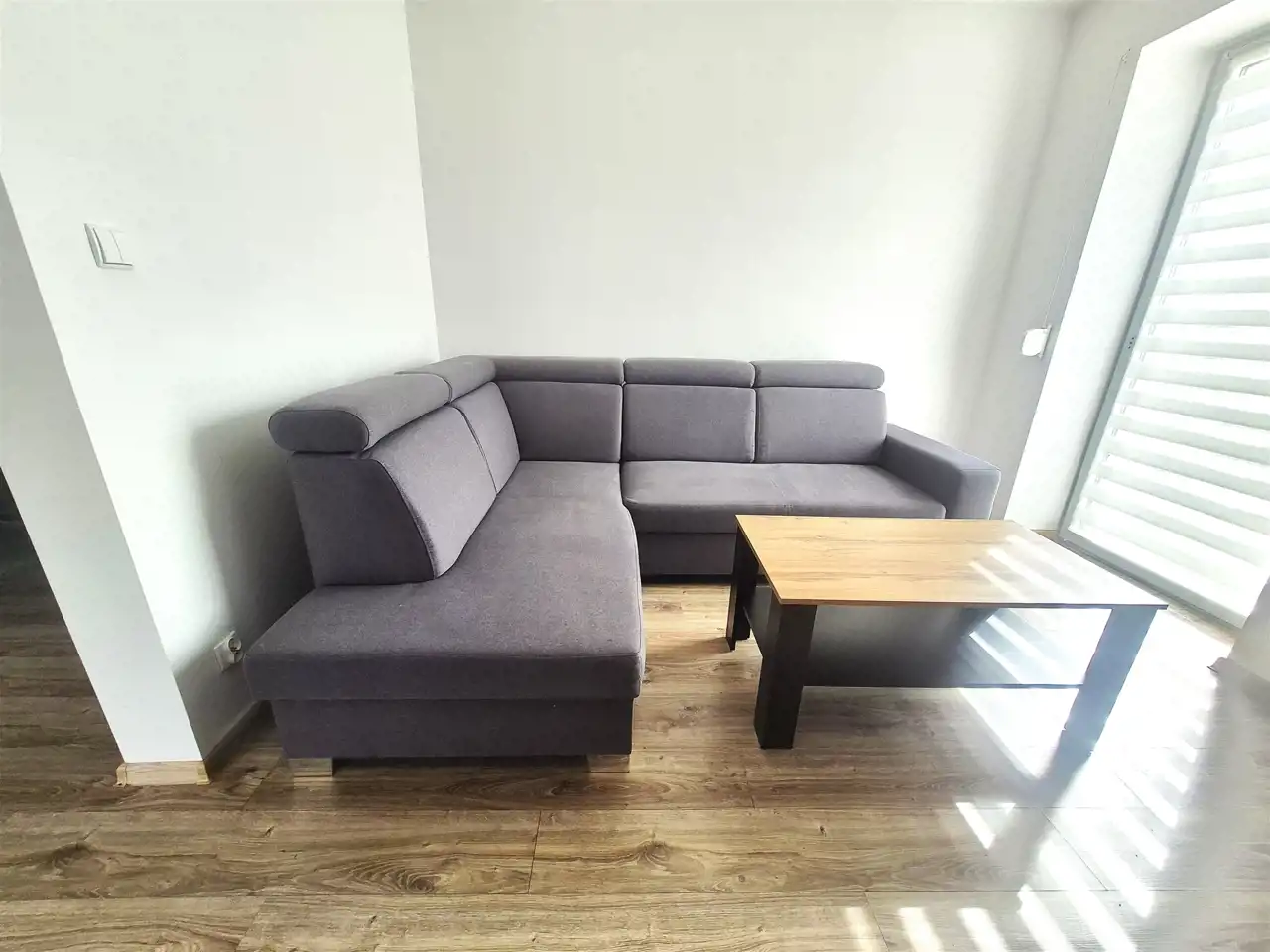Salon posiada kanapę narożną rozkładaną, stolik kawowy, pojemną komodę .