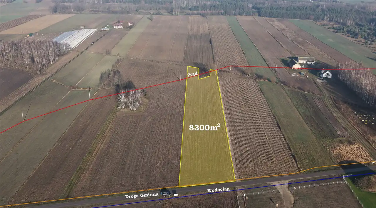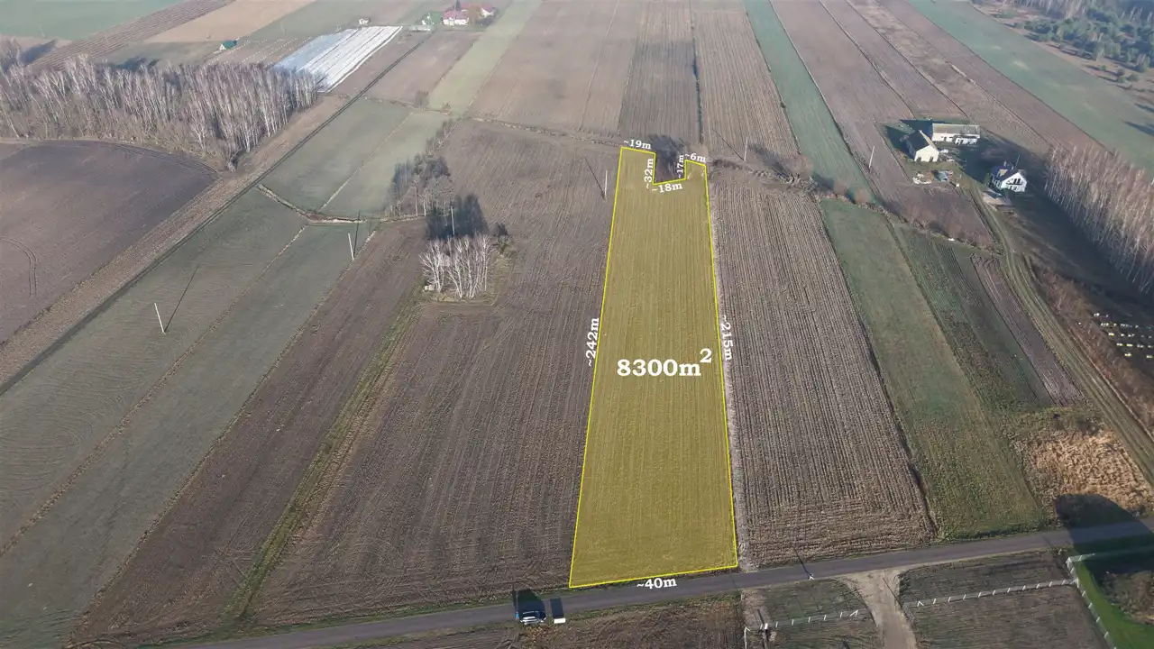 Działka o łącznej powierzchni 8300 m², z czego 2310 m² posiada wydane warunki zabudowy na budowę budynku mieszkalnego jednorodzinnego.