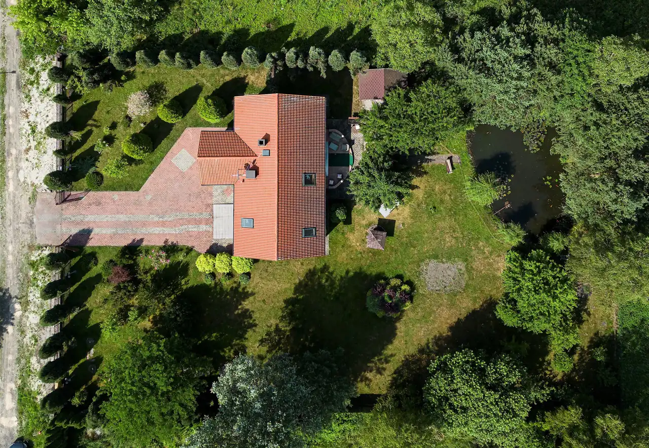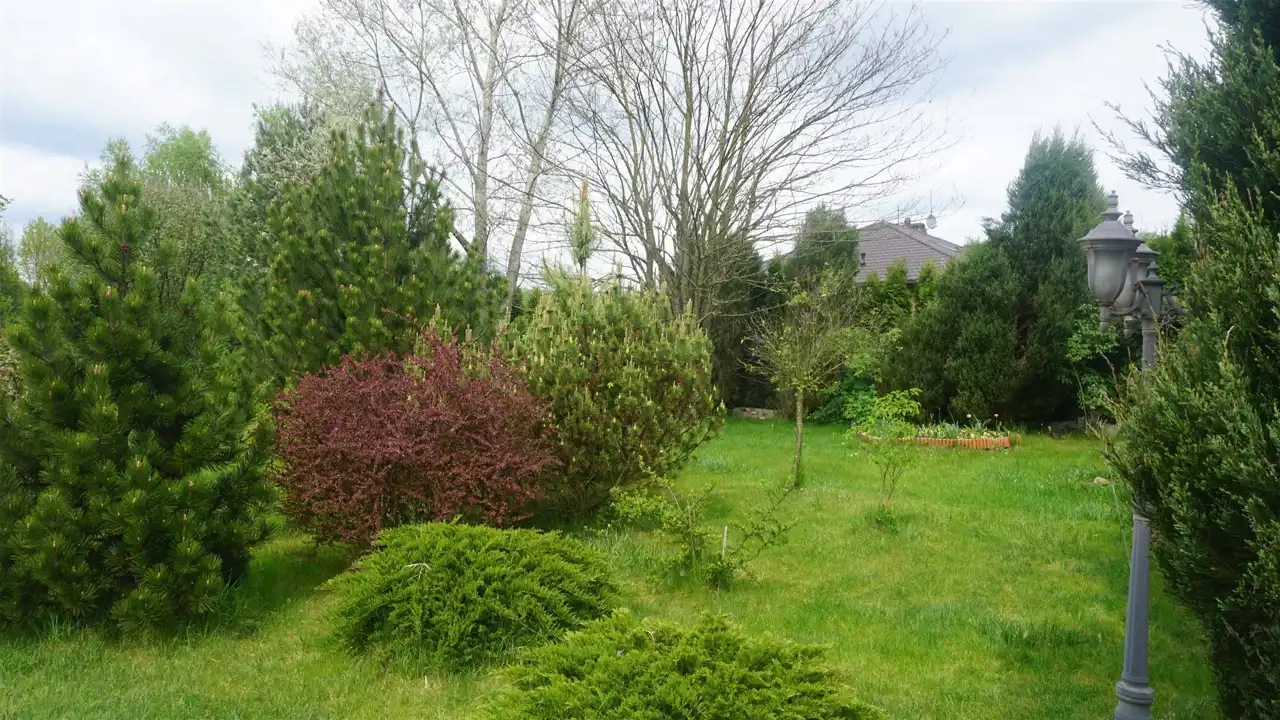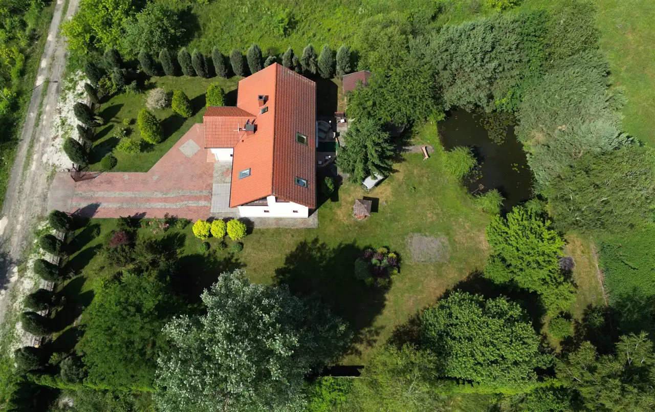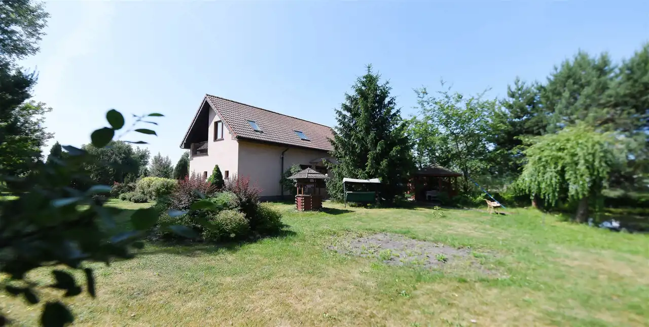 Dom położony jest na przepięknie zagospodarowanej działce o powierzchni 1925m2 z dużą ilością roślin. Na terenie posesji znajduje się zarybiony staw z pięknymi roślinami wodnymi. Własny system melioracyjny gwarantuje samoczynne odwodnienie działki w trakcie deszczu. Przed domem na terenie posesji znajduje się plac z kostki brukowej o pow. 120m2. Przy stawie usytuowany jest drewniany domek gospodarczy z wiatą na drewno oraz drewniana altanka i murowany grill.