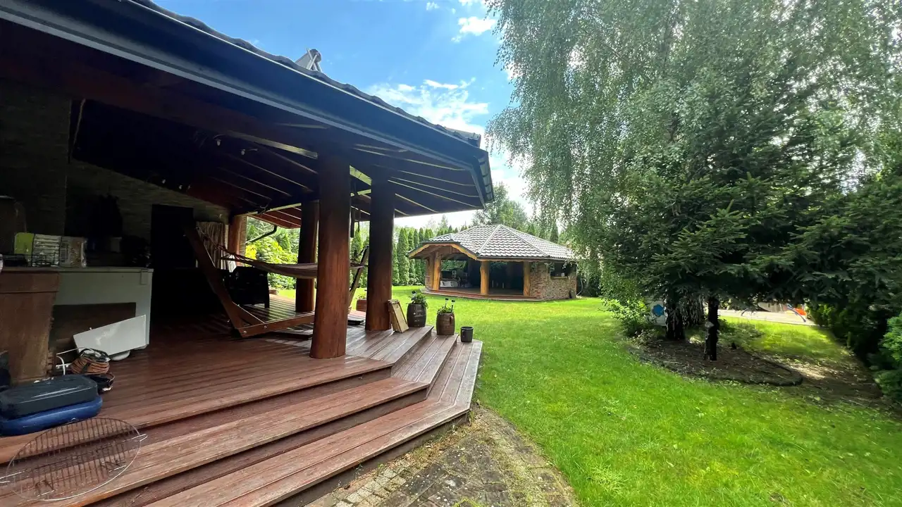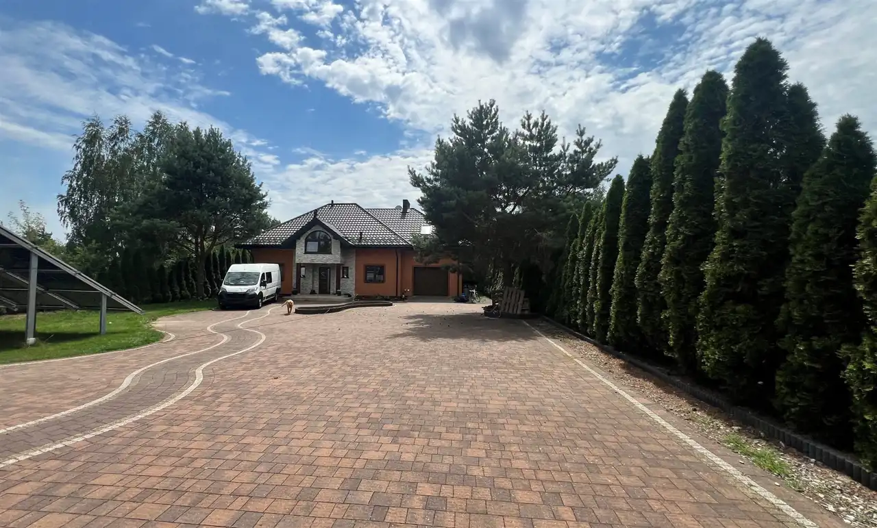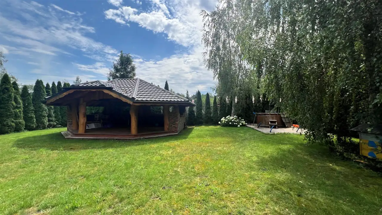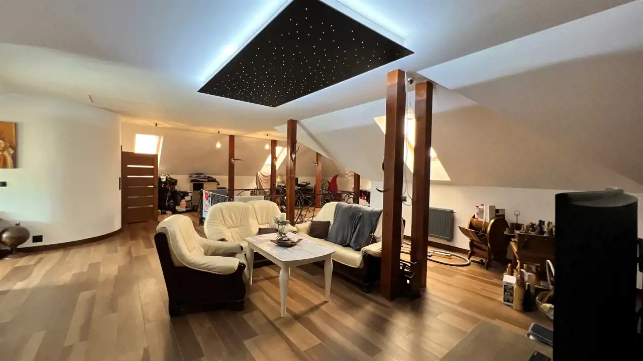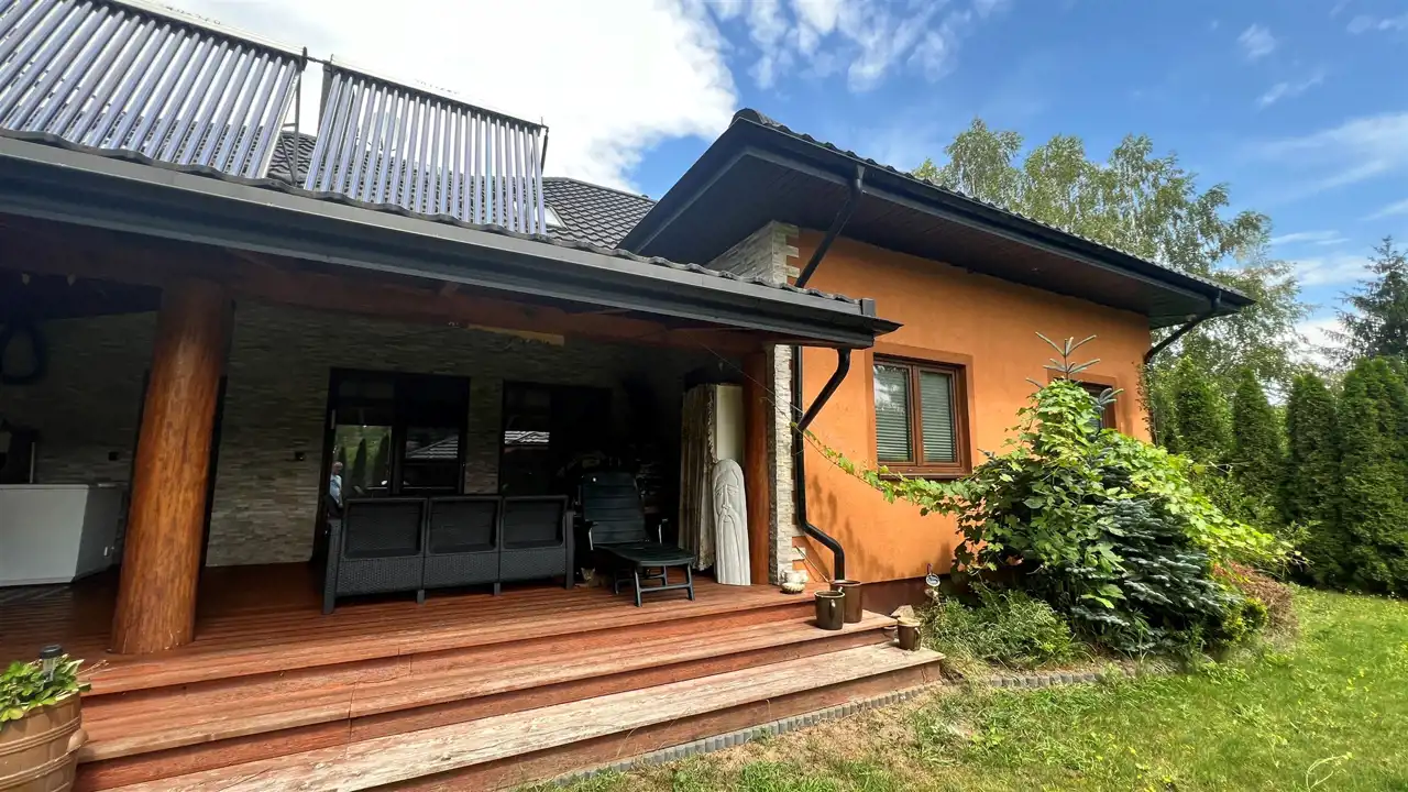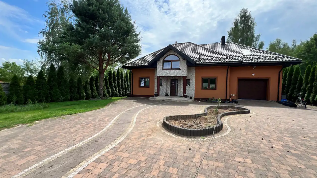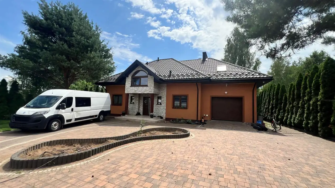 Oferujemy na sprzedaż dom wolnostojący o łącznej powierzchni użytkowej 330 m2. Nieruchomość została wybudowana w 2018 roku. Dach pokryty jest blachą a dom wybudowany jest z cegły. Budynek składa się z parteru oraz z poddasza. Na parterze znajdują się salon, kuchnia, 4 pokoje oraz łazienka. Na poddaszu jest jeden pokój oraz łazienka. Nieruchomość posiada także saunę. Schody, które prowadzą na poddasze wykonane są z marmuru. W bryle budynku dobudowany jest garaż, który jest podpiwniczony. Dom ogrzewany jest kominkiem oraz gazem z butli. Działka, na której usytuowana jest nieruchomość ma powierzchnię 2377 m2 oraz jest ogrodzona. Na podwórku znajdują się dwie duże altany. Nieruchomość uzbrojona jest w solary słoneczne, panele fotowoltaiczne oraz w bio oczyszczalnie ścieków. Dom znajduje się w malowniczej okolicy w Inowłodzu, niedaleko od Spały. W pobliżu płynie Rzeka Pilica.
