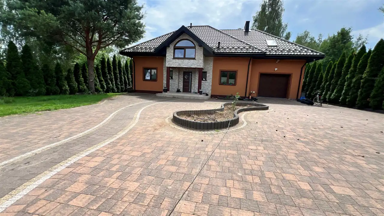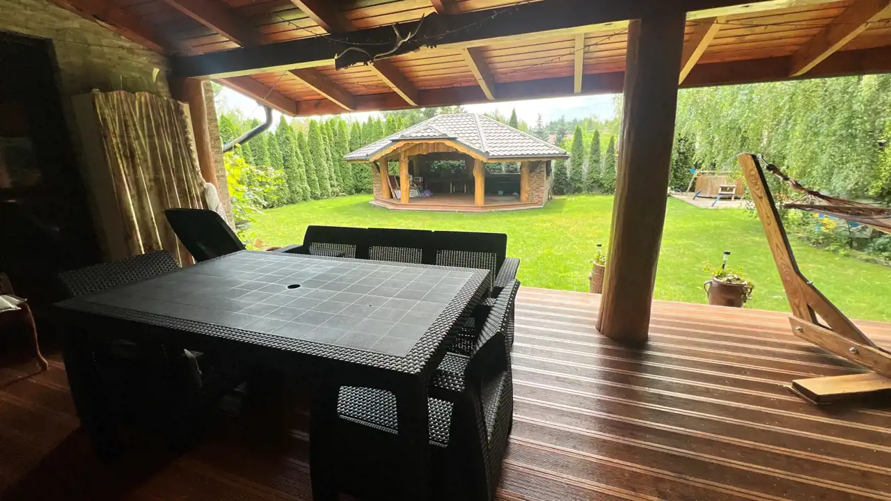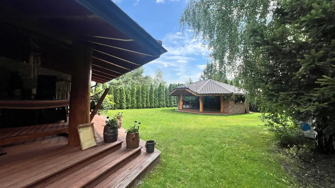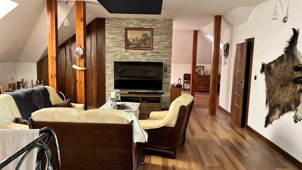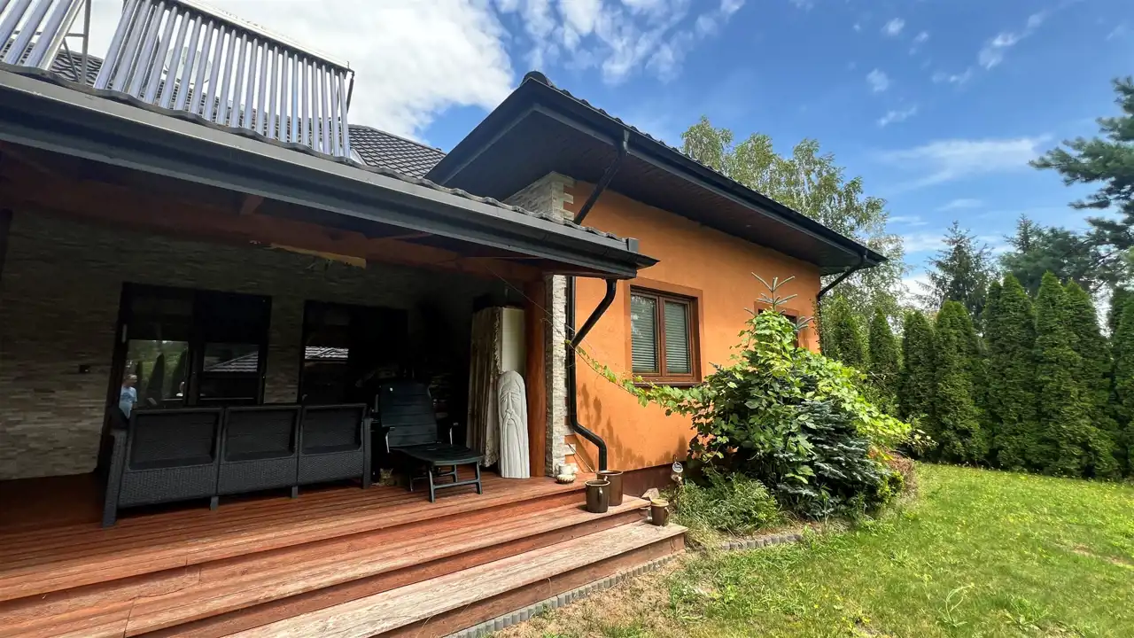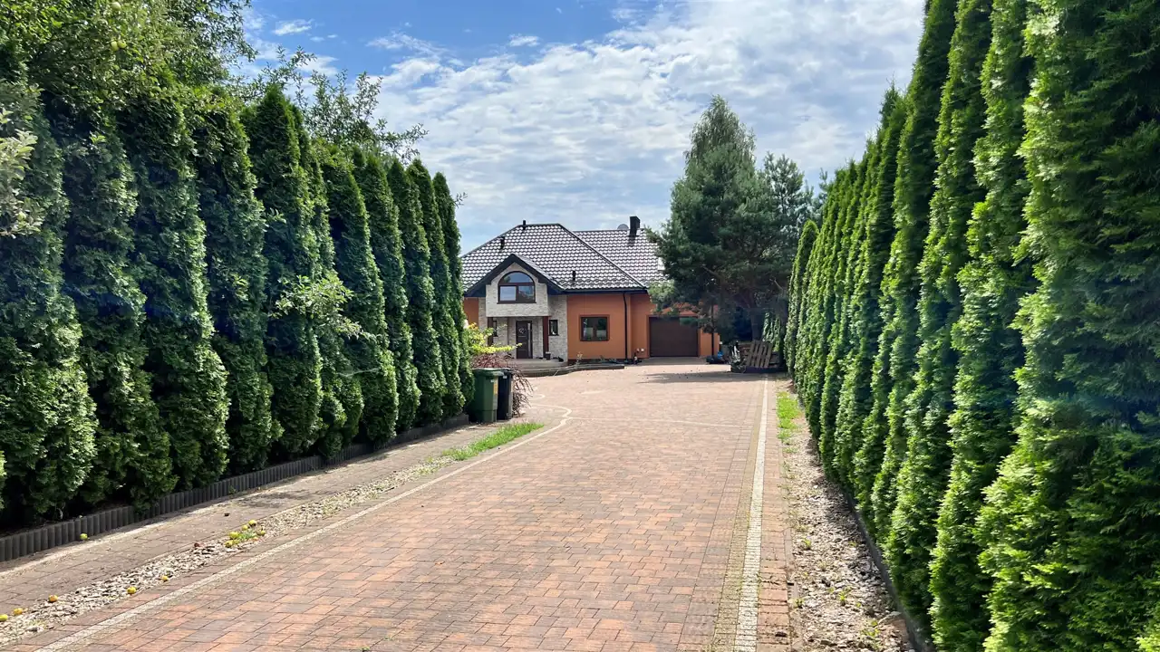 Oferujemy na sprzedaż dom wolnostojący o łącznej powierzchni użytkowej 330 m2. Nieruchomość została wybudowana w 2018 roku. Dach pokryty jest blachą a dom wybudowany jest z cegły. Budynek składa się z parteru oraz z poddasza. Na parterze znajdują się salon, kuchnia, 4 pokoje oraz łazienka. Na poddaszu jest jeden pokój oraz łazienka. Nieruchomość posiada także saunę. Schody, które prowadzą na poddasze wykonane są z marmuru. W bryle budynku dobudowany jest garaż, który jest podpiwniczony. Dom ogrzewany jest kominkiem oraz gazem z butli. Działka, na której usytuowana jest nieruchomość ma powierzchnię 2377 m2 oraz jest ogrodzona. Na podwórku znajdują się dwie duże altany. Nieruchomość uzbrojona jest w solary słoneczne, panele fotowoltaiczne oraz w bio oczyszczalnie ścieków. Dom znajduje się w malowniczej okolicy w Inowłodzu, niedaleko od Spały. W pobliżu płynie Rzeka Pilica.