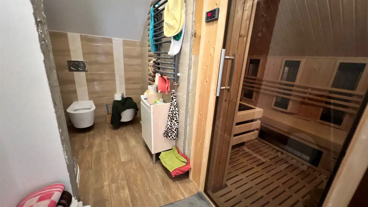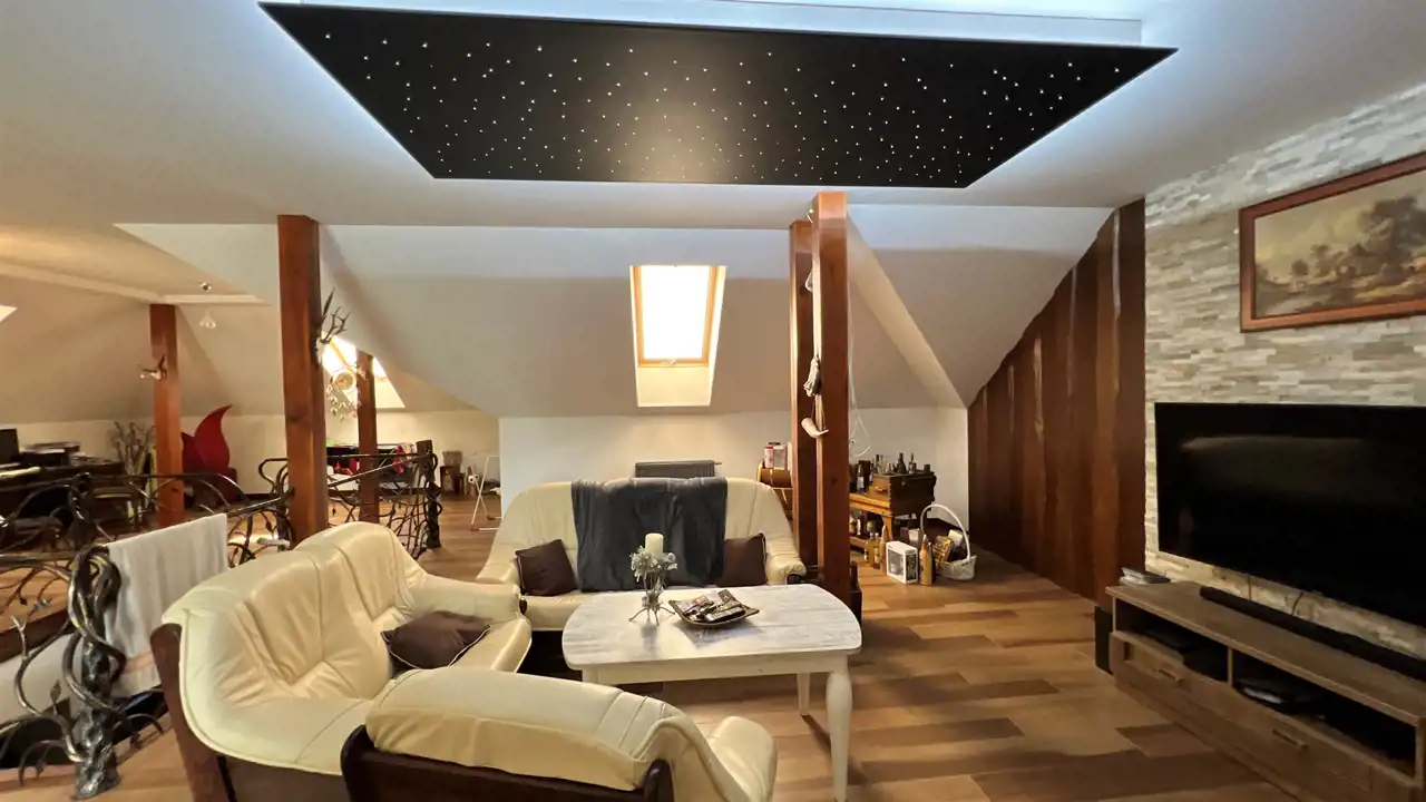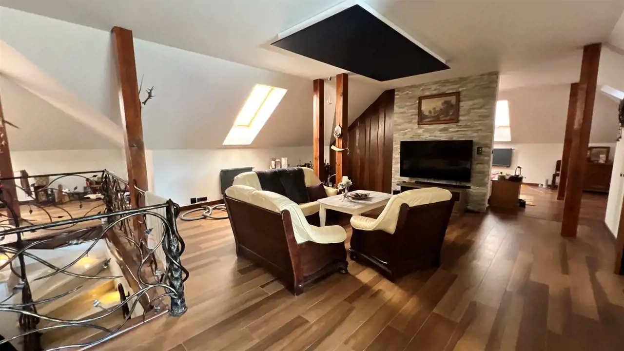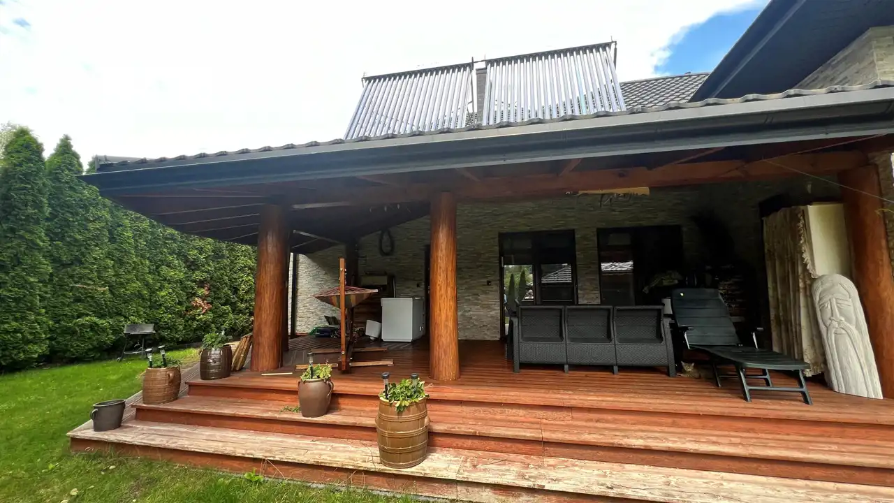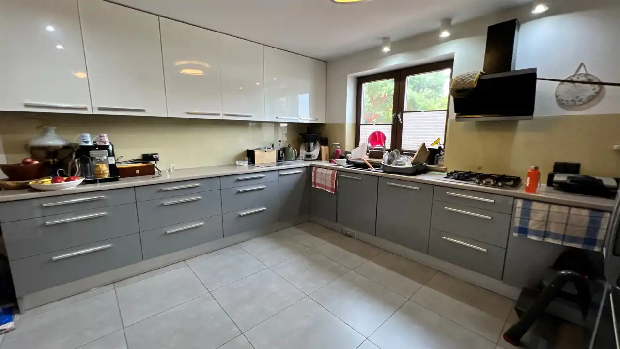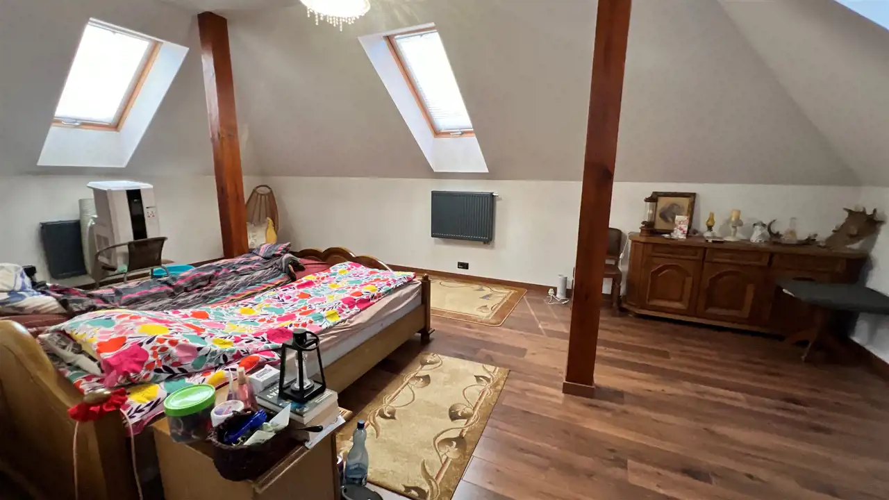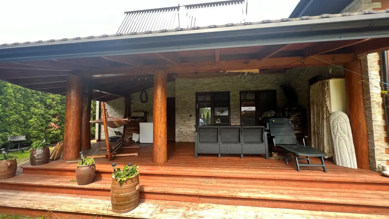 Oferujemy na sprzedaż dom wolnostojący o łącznej powierzchni użytkowej 330 m2. Nieruchomość została wybudowana w 2018 roku. Dach pokryty jest blachą a dom wybudowany jest z cegły. Budynek składa się z parteru oraz z poddasza. Na parterze znajdują się salon, kuchnia, 4 pokoje oraz łazienka. Na poddaszu jest jeden pokój oraz łazienka. Nieruchomość posiada także saunę. Schody, które prowadzą na poddasze wykonane są z marmuru. W bryle budynku dobudowany jest garaż, który jest podpiwniczony. Dom ogrzewany jest kominkiem oraz gazem z butli. Działka, na której usytuowana jest nieruchomość ma powierzchnię 2377 m2 oraz jest ogrodzona. Na podwórku znajdują się dwie duże altany. Nieruchomość uzbrojona jest w solary słoneczne, panele fotowoltaiczne oraz w bio oczyszczalnie ścieków. Dom znajduje się w malowniczej okolicy w Inowłodzu, niedaleko od Spały. W pobliżu płynie Rzeka Pilica.