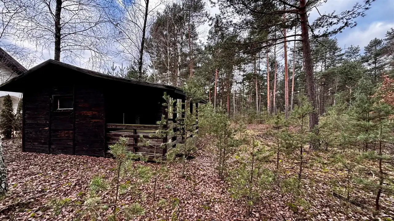 Na działce znajduje się również drewniane pomieszczenie gospodarcze, idealne na składowanie narzędzi lub drewna opałowego.