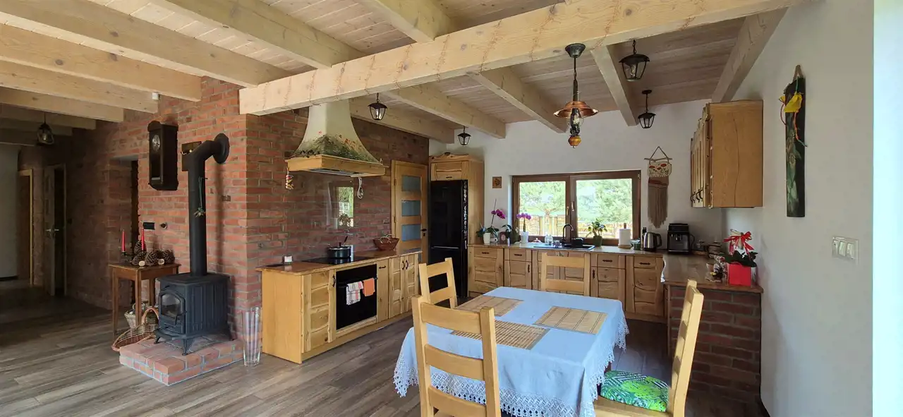 Wewnątrz budynku rozprowadzone ogrzewanie podłogowe na całej powierzchni domu. Piec jednofunkcyjny kondensacyjny z zasobnikiem 100 litrów. Gaz z własnej butli 2700 m3. Sufity w domu wykończone świerkiem bielonym + belki. Fragmenty ścian z cegły ręcznie formowanej. Przygotowane miejsce pod kominek bądź kozę. Biologiczna przydomowa oczyszczalnia ścieków. Taras drewniany. Kostka przed domem. Ogrodzenie panelowe z 3 stron.