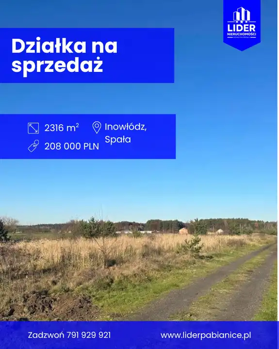 Biuro nieruchomości Lider Nieruchomości Pabianice oferuje na sprzedaż działkę budowlaną położoną w miejscowości Królowa Wola o pow. 2316 m2 wymiary 32 m X 74 m