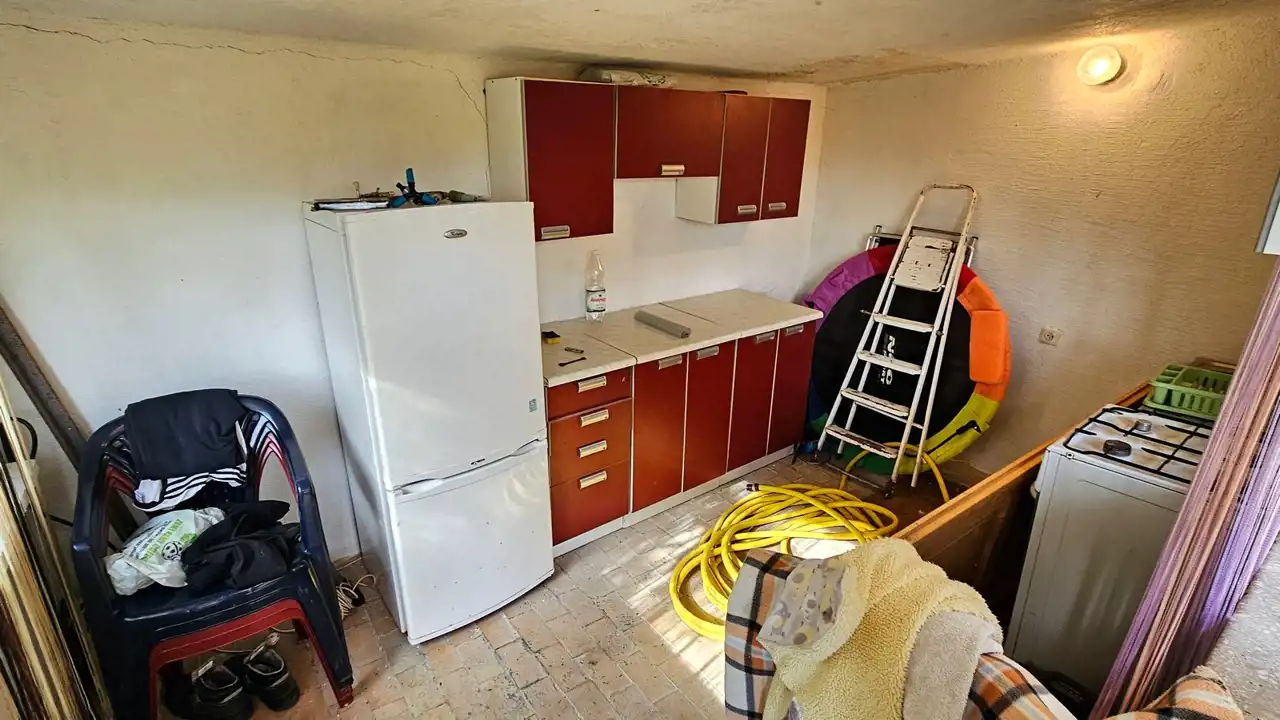 Domek jest murowany z pustaka. Papa na dachu. Okna PCV i drewniane. Ogrzewanie elektryczne. Piwnica. Aneks kuchenny. Oddzielne WC. Na parterze salon z aneksem kuchennym. Oddzieln WC. Na dole piwnica. Do zamieszkania od zaraz. Na podłogach kafle. Tynki. Łóżko w sypialni. Stolik. W kuchni zabudowa kuchenna. Taras. Prąd, woda działkowa. Działka w całości ogrodzona płotem z siatki. Zagospodarowana. Szambo. Zadaszony Taras. Na działce posadzone drzewa, krzewy ozdobne. Wiśnia, gruszka, śliwka, jabłoń. Grill murowany, huśtawka. Blisko do jeziora Pakowskiego i plaży.