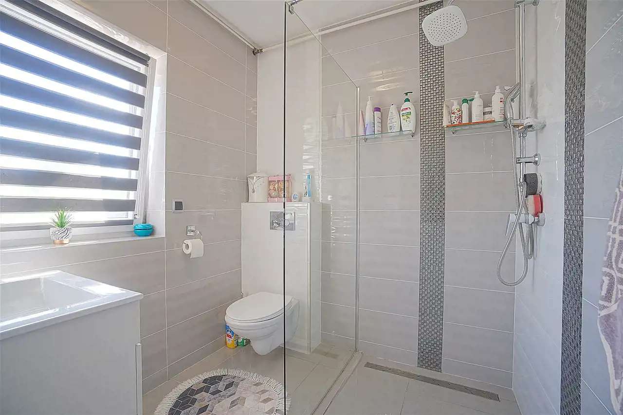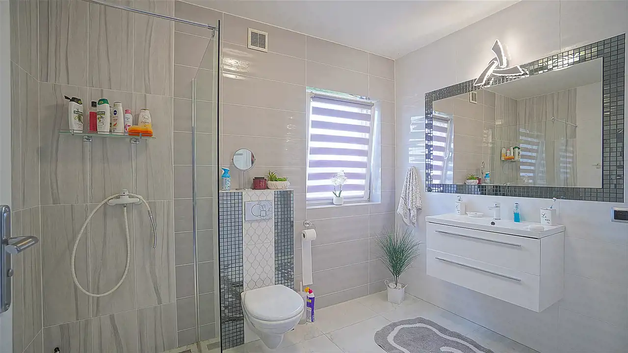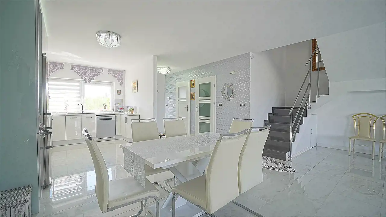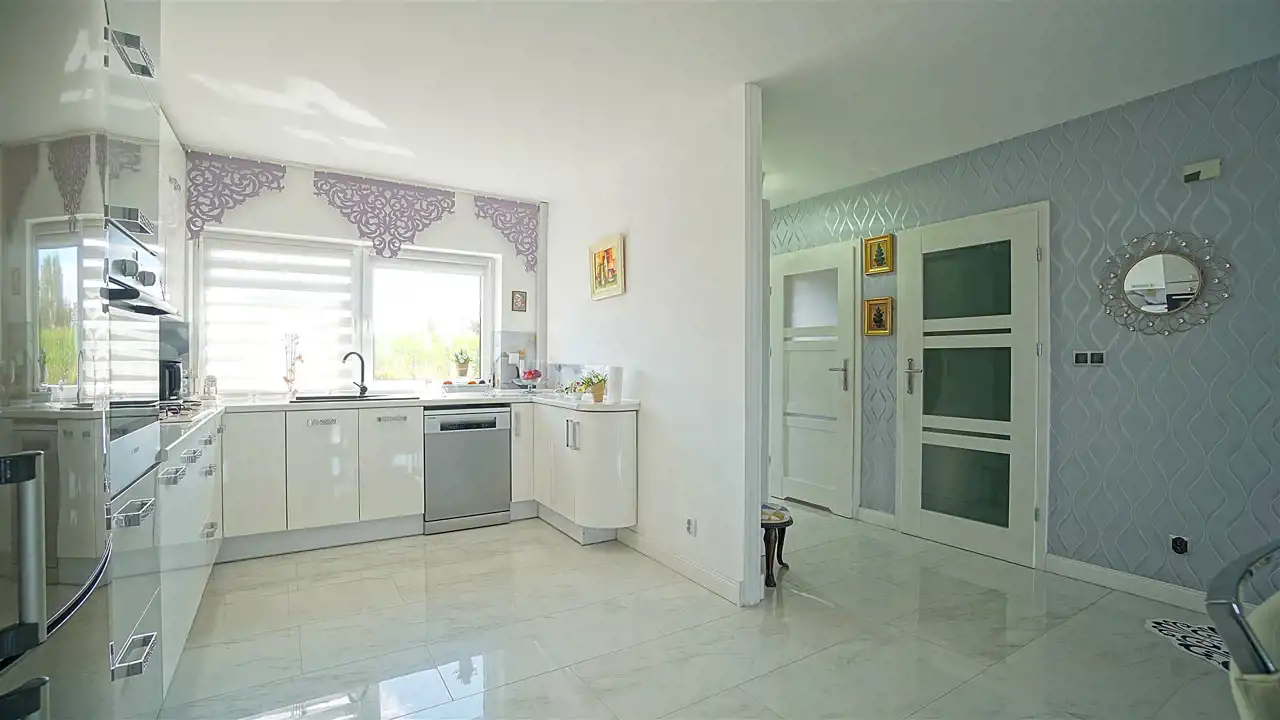 Parter domu wyłożony jasnym gresem polerowanym o podwyższonym standardzie oraz glazurą i terakotą w łazience i pralni z kotłownią. Parter domu z ogrzewaniem podłogowym zasilanym piecem gazowym firmy Junkers, na piętrze konwektory.