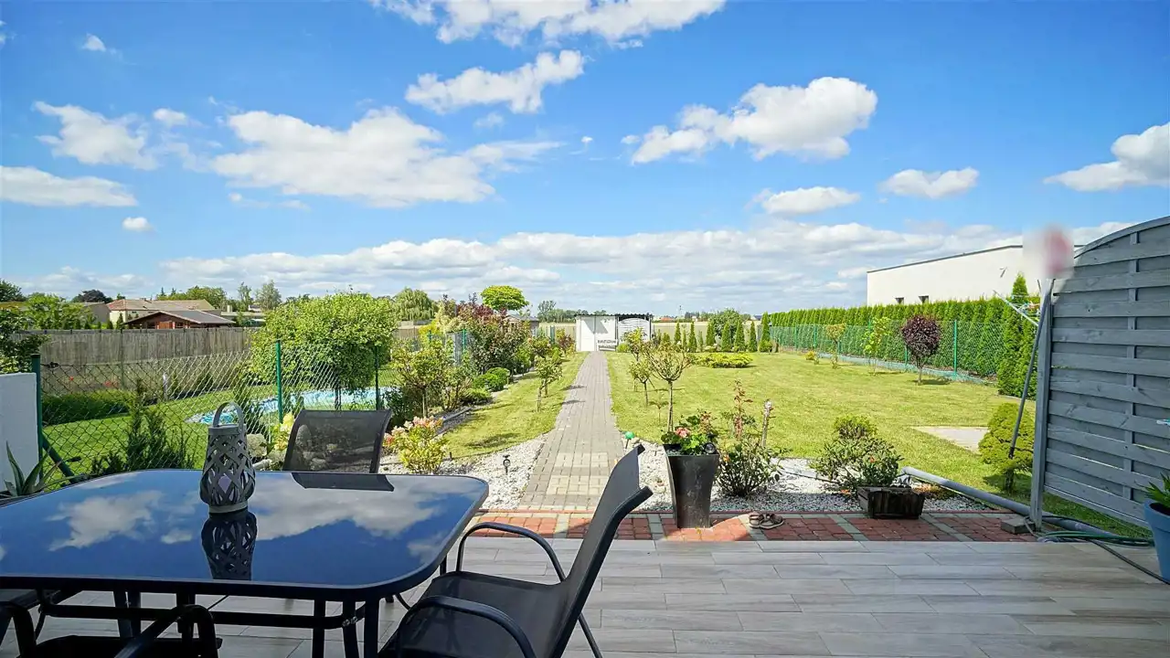 Posesja ogrodzona, zabezpieczona w rolety antywłamaniowe, z pięknie zagospodarowanym ogrodem, na której znajduje się nieduży budynek gospodarczy z drewutnią.