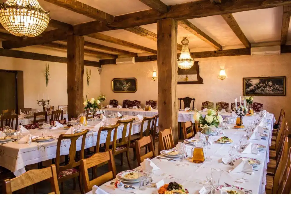 Na parterze zajazdu znajdują się 4 sale restauracyjno – biesiadne, drink bar, szatnia, toalety, taras zewnętrzny, duża kuchnia z 5 pomieszczeniami gospodarczymi oraz chłodnią, zmywalnia, pralnia, kotłownia z piecem centralnego ogrzewania i ciepłej wody zasilanym na olej opałowy oraz podłączenie gazu ciekłego do zasilania piecy kuchennych ze zbiornikiem 2000 l.