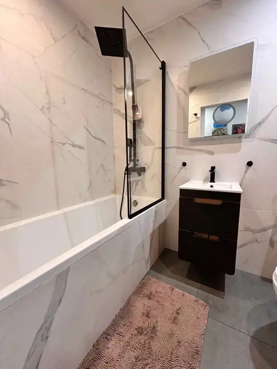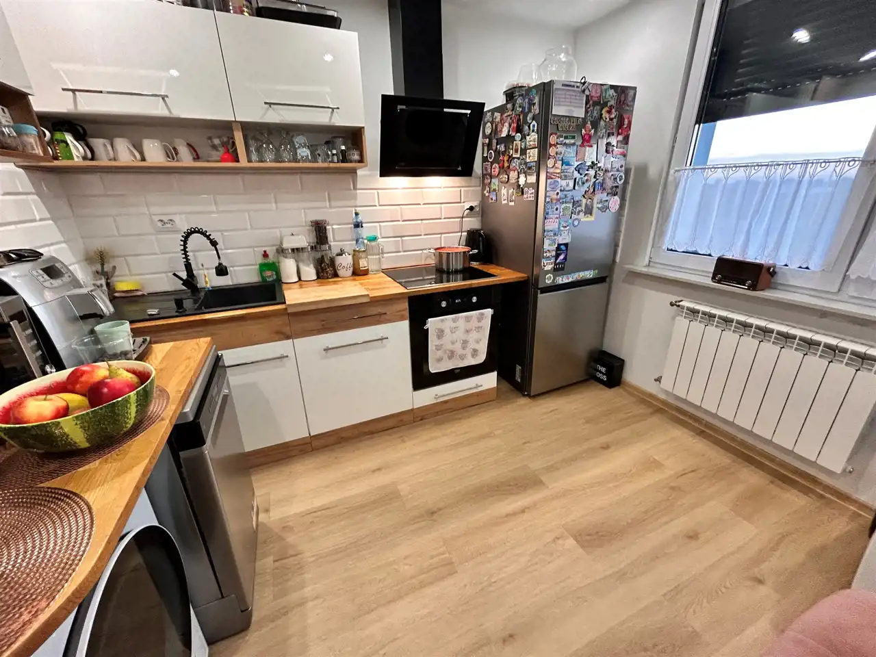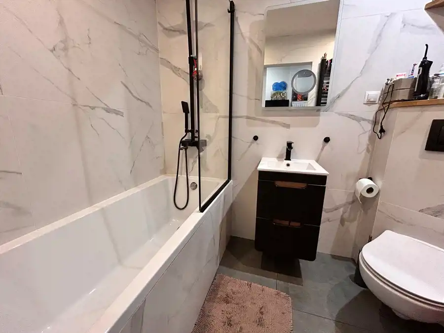 W pokojach gładzie na ścianach, na podłodze panele. W kuchni na podłodze panele, na ścianach gładzie oraz w pasie roboczym płytki ceramiczne. Meble kuchenne wraz z zmywarką , piekarnikiem oraz płytą indukcyjną wliczone w cenę mieszkania. W łazience płytki gresowe na podłodze oraz na ścianach. Łazienka wyposażona w wannę z wbudowaną szybą, dzięki czemu można korzystać też z prysznica, WC ze stelażem podtynkowym oraz umywalkę z wiszącą szafką. W lokalu została wymieniona elektryka oraz rury wodno-kanalizacyjne.