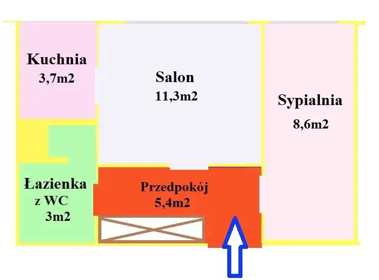 W skład mieszkania wchodzą dwa pokoje (11,3 m² i 8,6 m²), otwarta, jasna kuchnia (3,7 m²), łazienka z WC oraz wygodny przedpokój (5,4 m²). Do lokalu przynależy piwnica 2,70m².