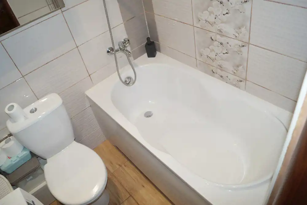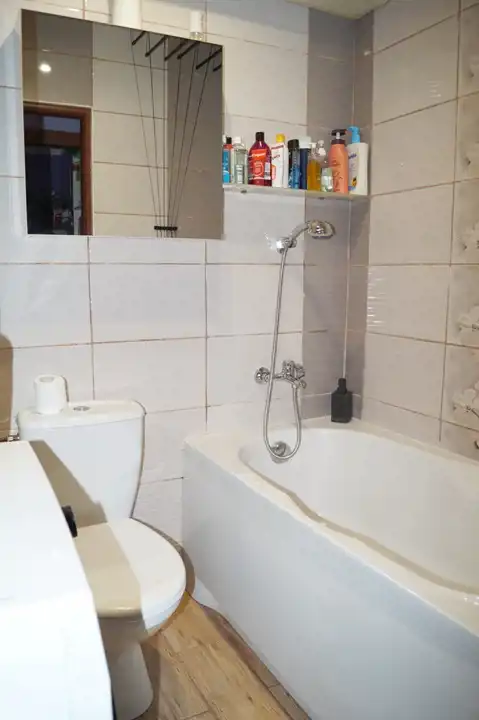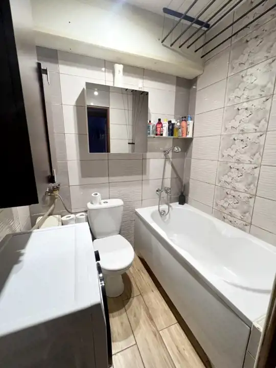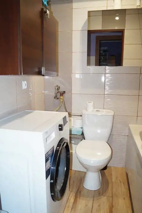 W łazience znajduje się wanna, szafka z umywalką, lustro, pralka oraz WC.