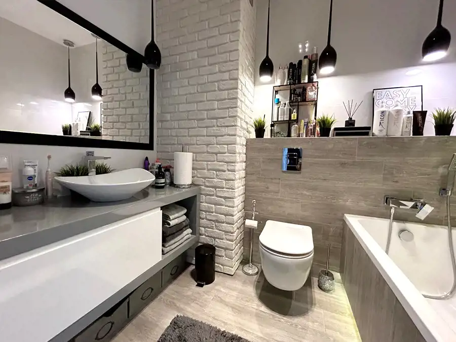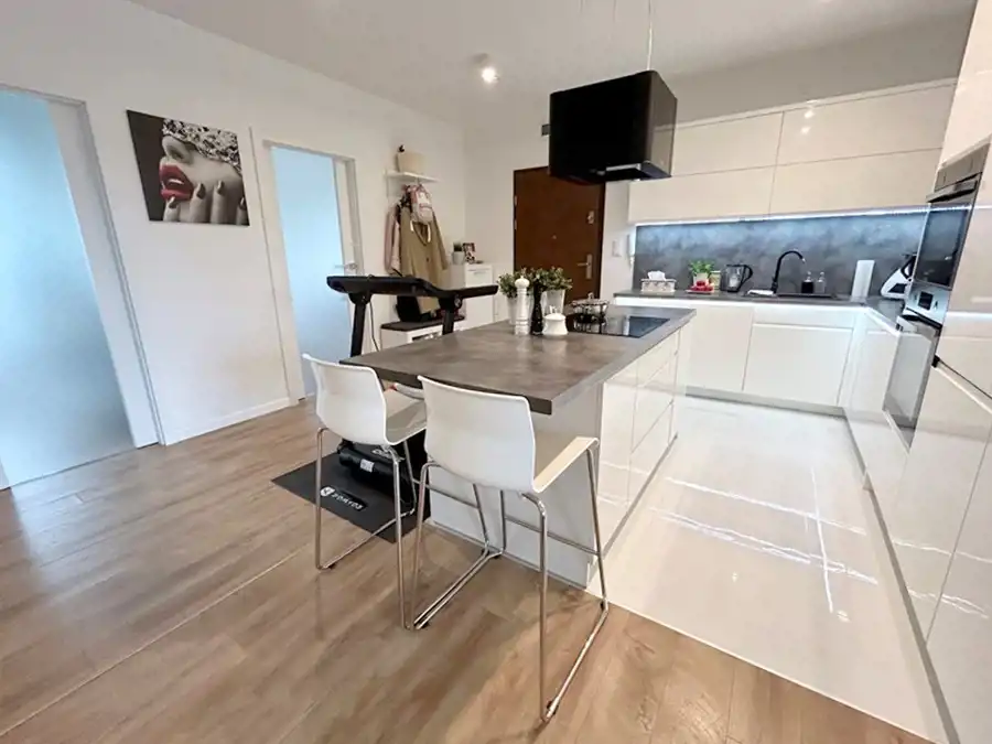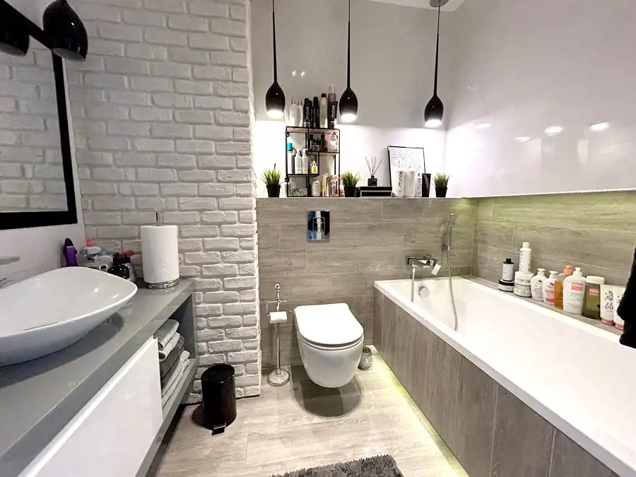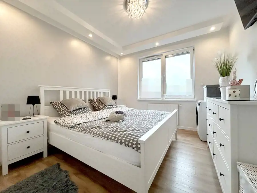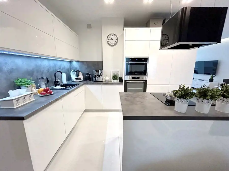 W kuchni znajduje się nowoczesna zabudowa wraz ze sprzętem AGD (lodówka, płyta indukcyjna, piekarnik, zmywarka, okap). Łazienka funkcjonalna- wyposażona w wannę, umywalkę z szafką w zabudowie oraz WC ze stelażem podtynkowym.