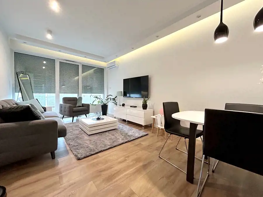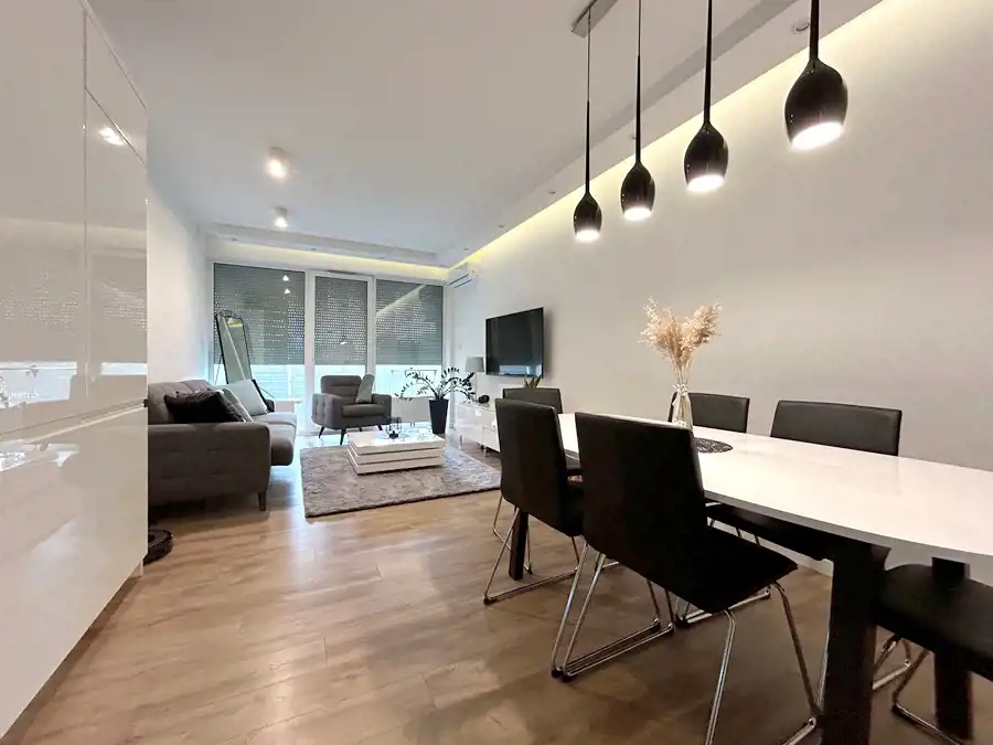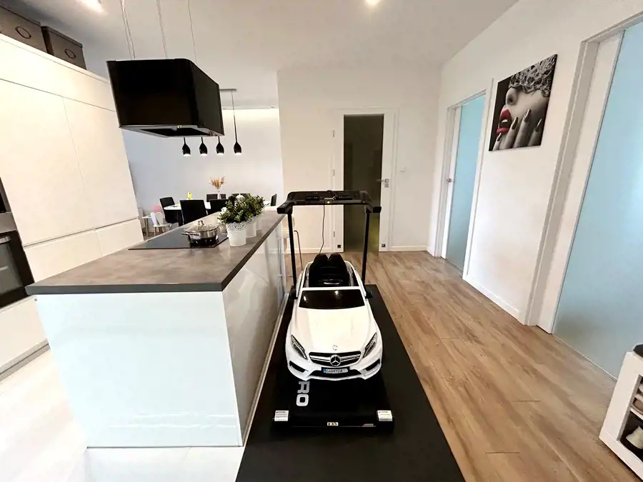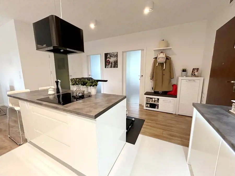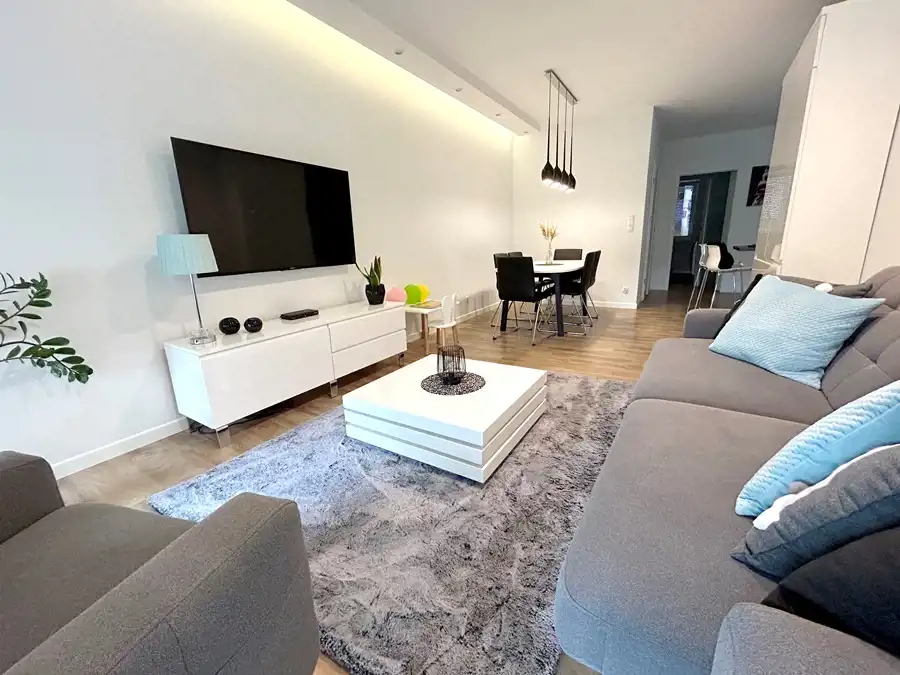 W kuchni znajduje się nowoczesna zabudowa wraz ze sprzętem AGD (lodówka, płyta indukcyjna, piekarnik, zmywarka, okap). Łazienka funkcjonalna- wyposażona w wannę, umywalkę z szafką w zabudowie oraz WC ze stelażem podtynkowym.