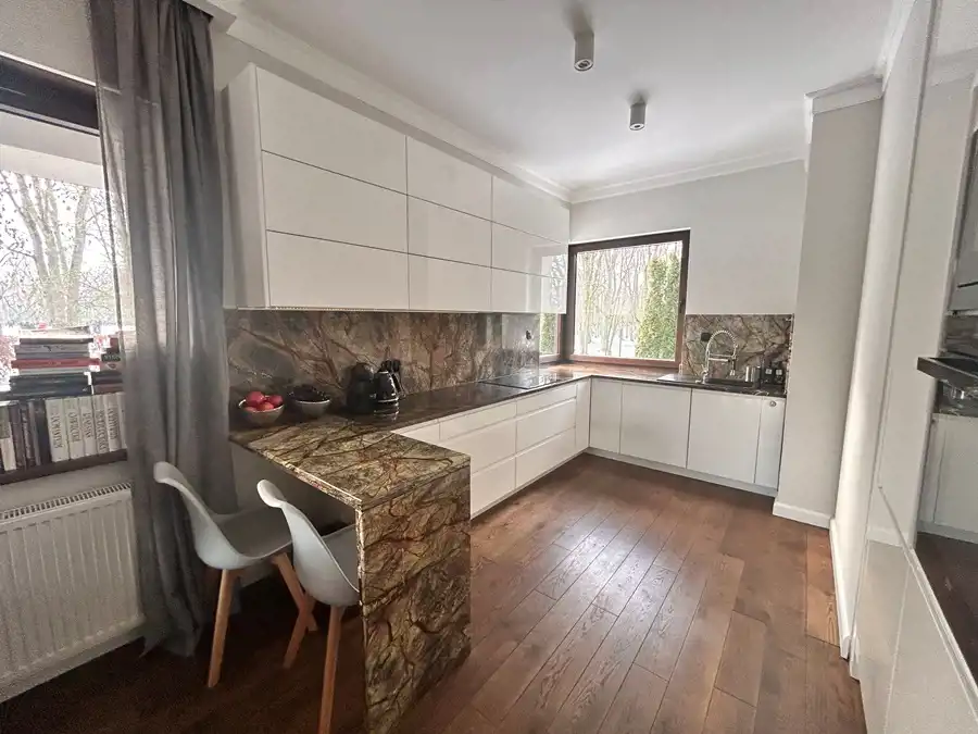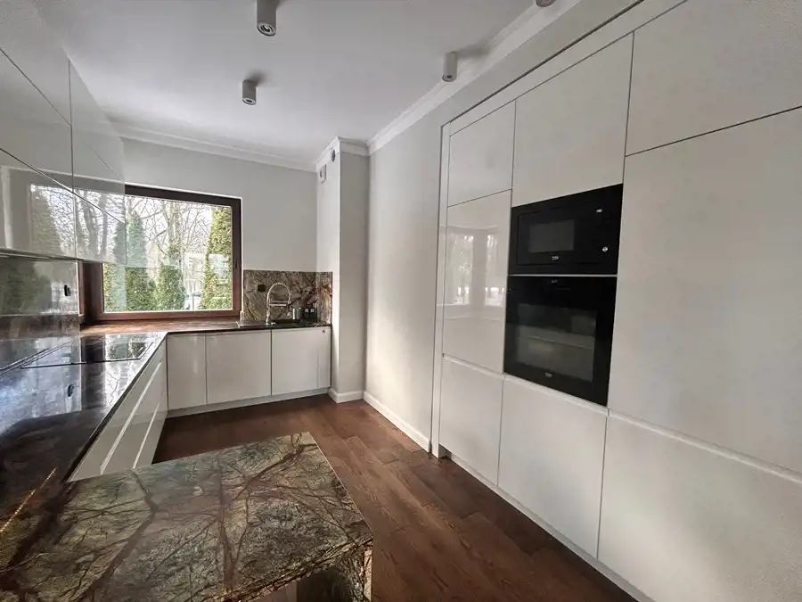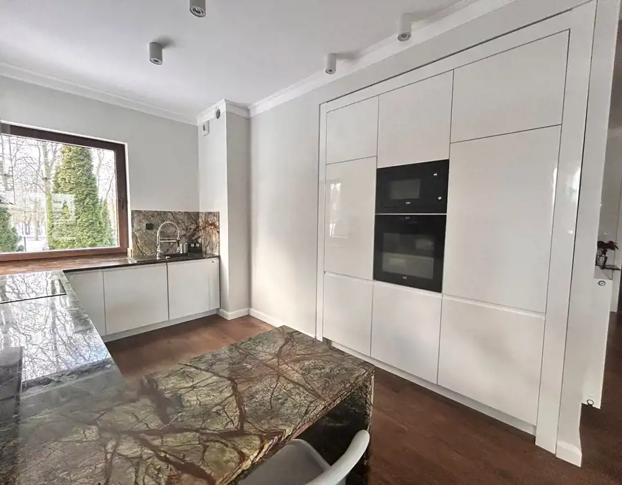 Aneks kuchenny: Został wyposażony w nowoczesną, zaprojektowaną zabudowę kuchenną wykonaną przez stolarza z wykorzystaniem każdej wolnej przestrzeni, aby korzystanie z mebli było praktyczne i funkcjonalne, a blaty kuchenne zostały wykonane z marmuru. Kuchnia została doposażona w sprzęt AGD renomowanych firm (lodówkę, okap, płytę indukcyjna, piekarnik, zmywarkę, mikrofalówkę). Dodatkowo pod szafkami wiszącymi zamontowano oświetlenie LED, które wieczorami pomoże stworzyć przytulną atmosferę.