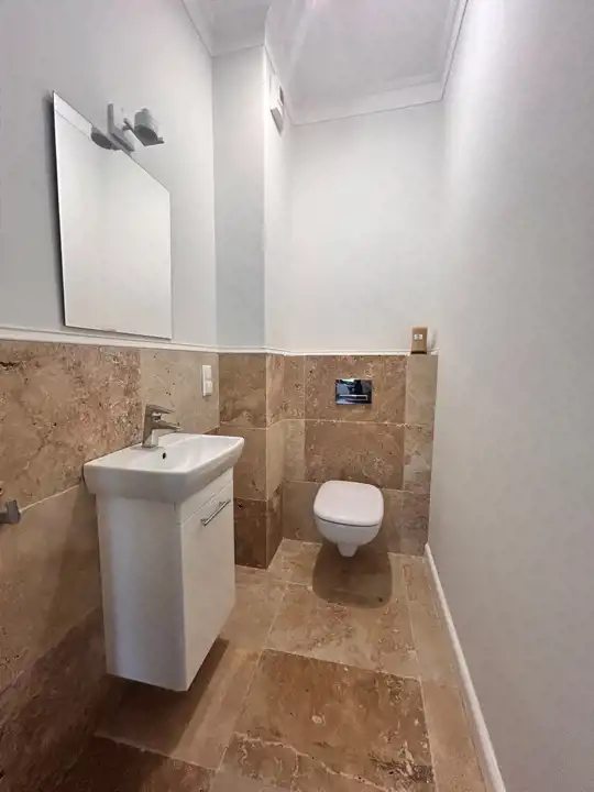 WC: W przypadku WC zastosowano zestaw podtynkowy ze stelażem podtynkowym, a także umywalkę z szafką. Nad umywalką zamontowano duże lustro dzięki czemu udało się uzyskać optyczne powiększenie przestrzeni.