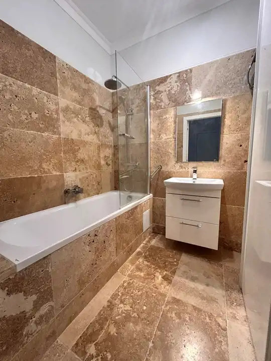 Łazienka: Ściany i podłoga zostały wykończone płytami gresowymi wysokiej jakości, dodatkowo łazienka została wyposażona w zabudowę łazienkową, a także wannę z wbudowaną szybę szklaną, dzięki czemu możemy korzystać z wanny, a także z prysznica.