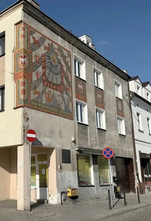 Kamienica z zegarem słonecznym otoczonym znakami zodiaku , obok znajdują się historyczne herby Inowrocławia jest to jedna z wizytówek miasta widoczna na wszystkich pocztówkach miasta!