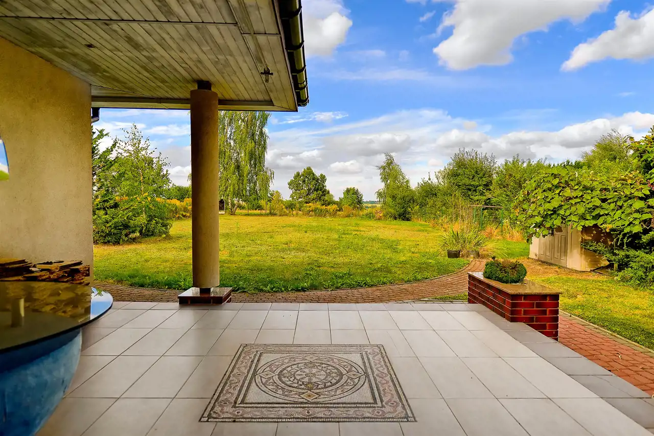 - duży taras od strony ogrodu wyłożony płytkami;
