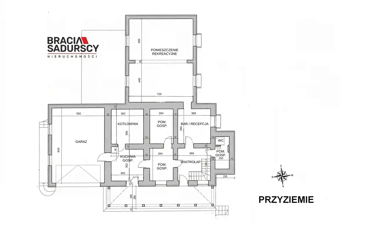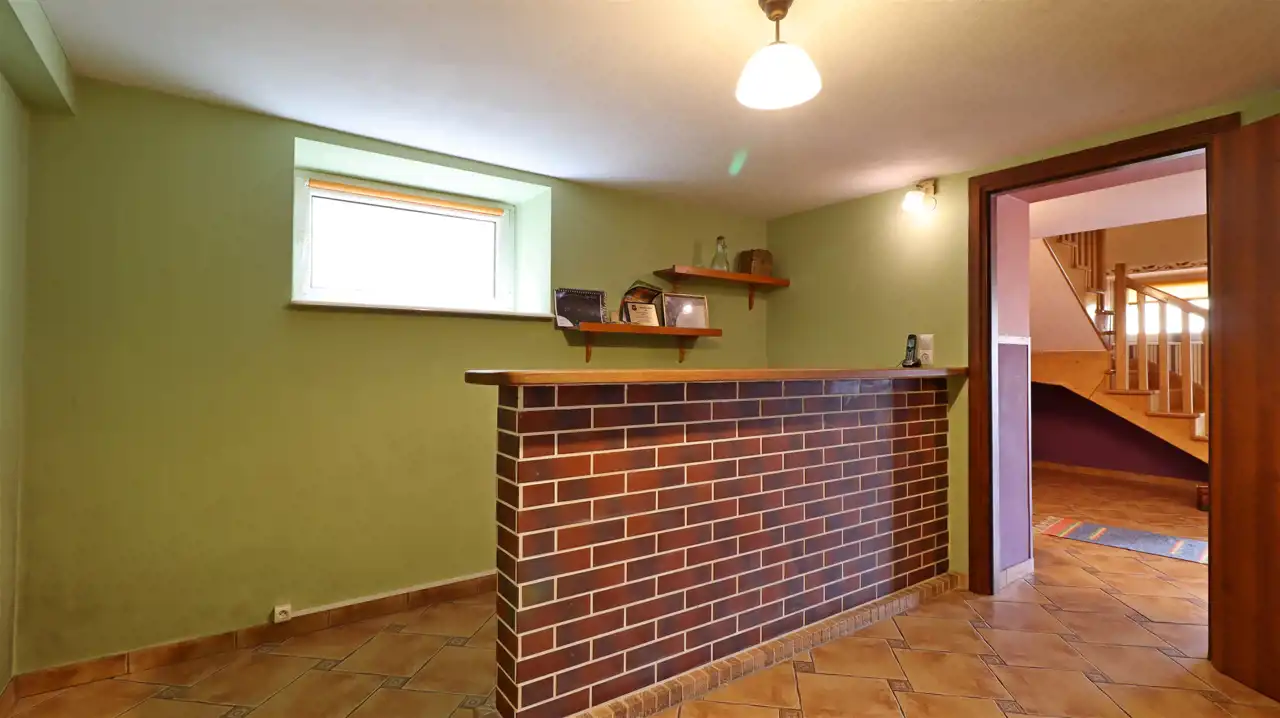 Piwnice (195,33 m²): garaż 50 m², pomieszczenie rekreacyjne 67 m², 4 pomieszczenia gospodarcze do adaptacji – możliwość przekształcenia na dodatkowe lokale lub strefy usługowe.
