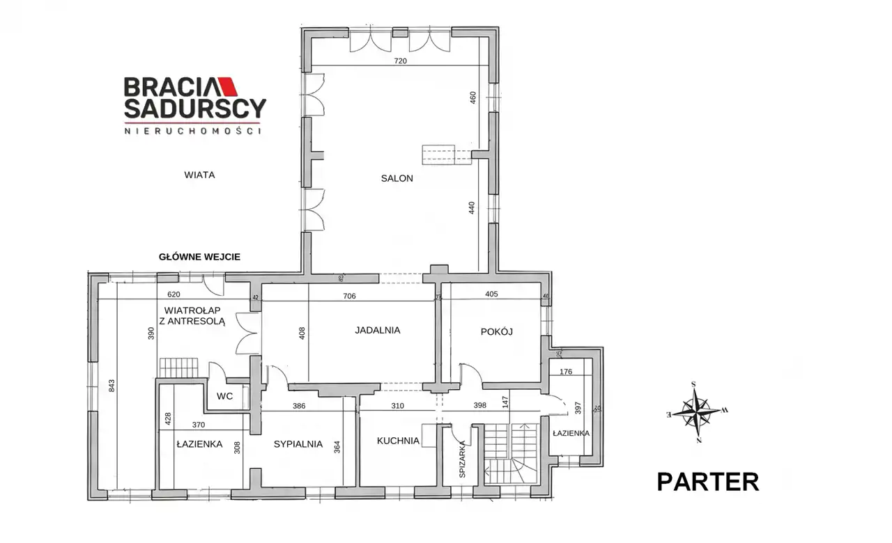 Parter (217,70 m²): duży salon 68,40 m², dwa pokoje (16 m² i 14 m²), kuchnia, jadalnia, 2 łazienki i WC, możliwość adaptacji wnętrz pod potrzeby reprezentacyjne lub rekreacyjne.
