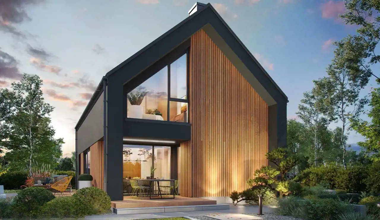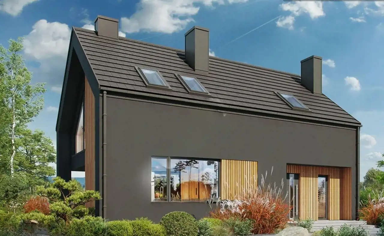 - Ściany zewnętrzne: pustak Thermobet 25cm, ocieplenie zewnętrzne styropian 20cm, tynk elewacyjny, deski dekoracyjne,