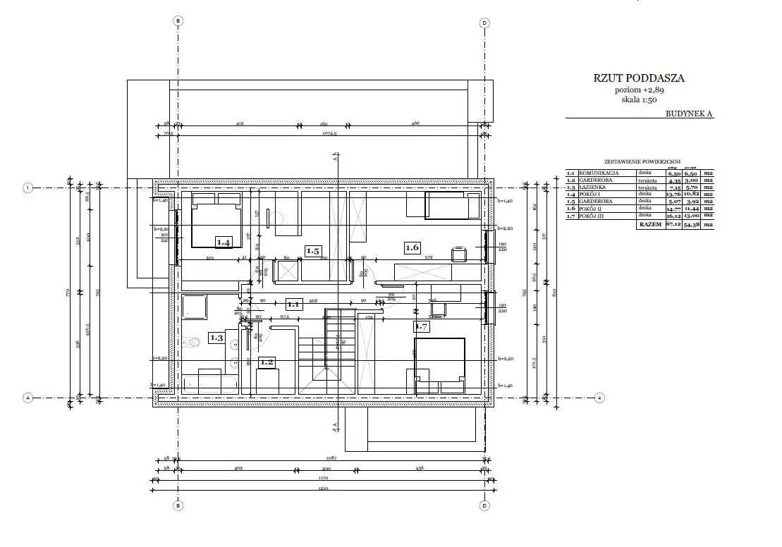 Poddasze: komunikacja (6,5m2), garderoba (3m2), łazienka (5,7m2), pokój (10,82m2), garderoba (3,92m2), pokój (11,44m2), pokój (13m2) - razem 54,38m2