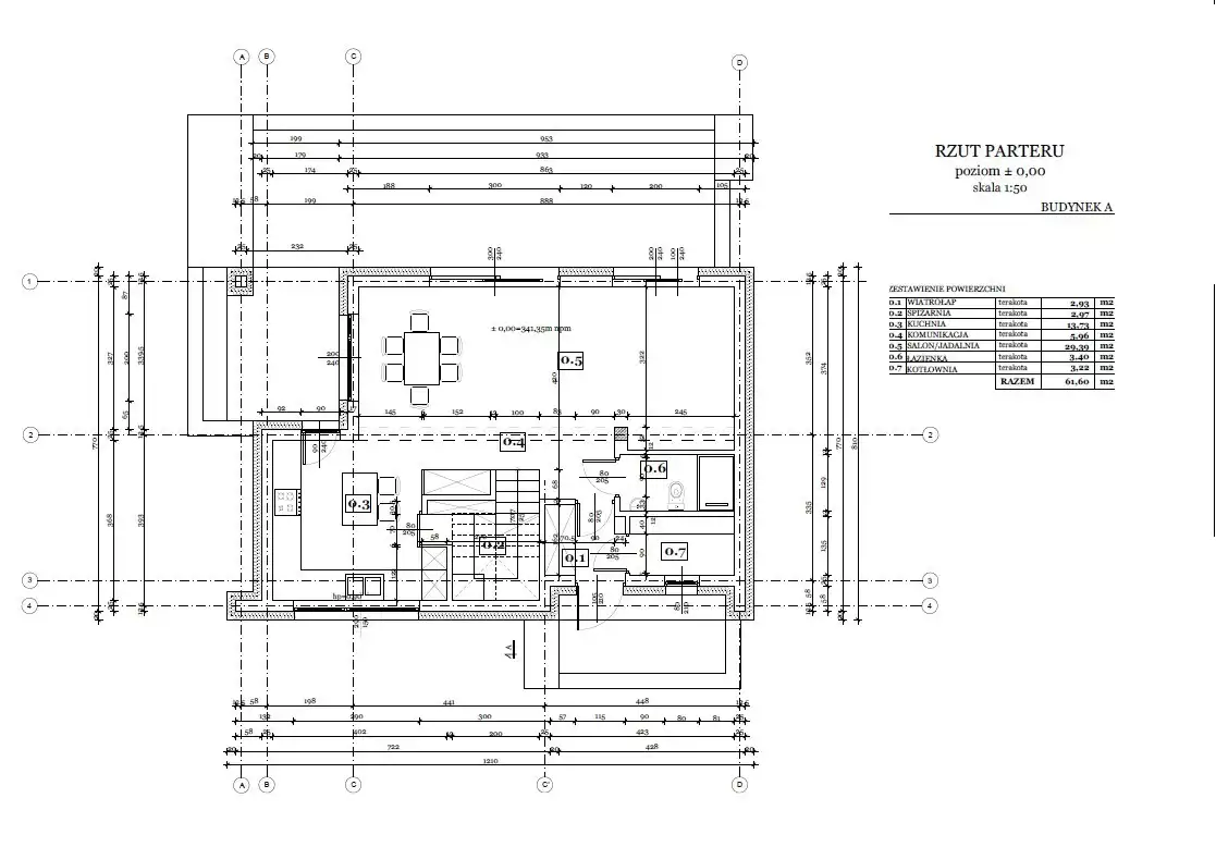 Parter: wiatrołap (2,93m2), spiżarnia (2,97m2), kuchnia (13,73), komunikacja (5,96m2), salon/jadalnia (29,39m2), łazienka (3,4m2), kotłowania (3,22m2) - razem 61,6m2