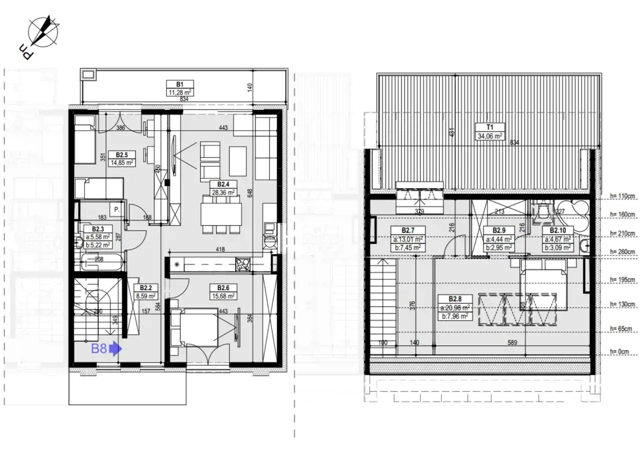 Poddasze: korytarz (7,45m2), pokój (7,96m2), garderoba (2,95m2), łazienka (3,09m2)