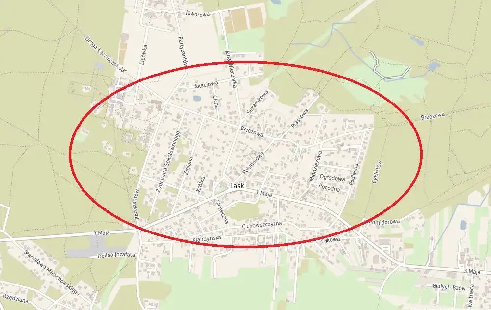 Oferujemy do sprzedaży działkę budowlaną o powierzchni 2100 m2, zlokalizowaną w Laskach (gmina Izabelin), w rejonie ulicy Brzozowej.