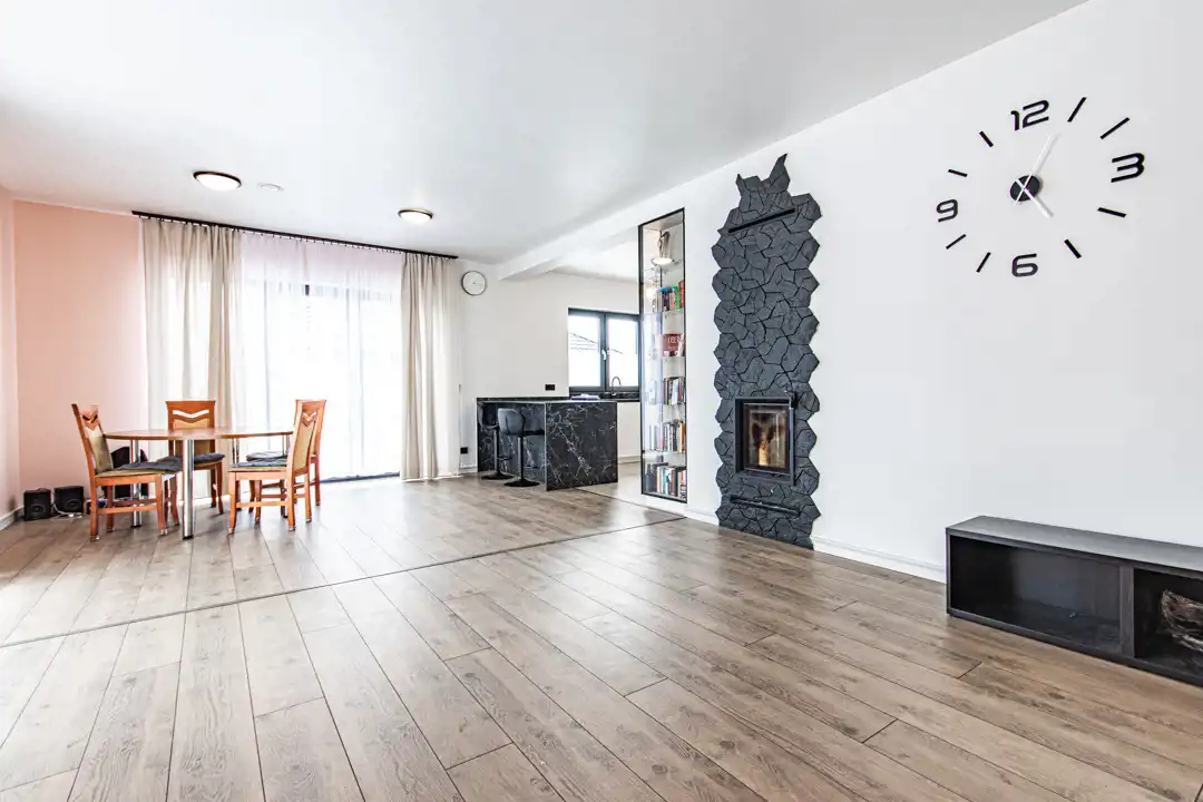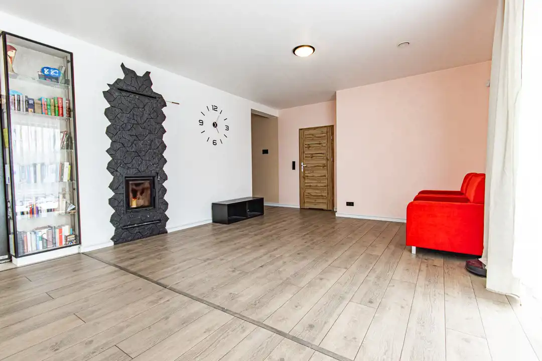 W całym domu zastosowano ogrzewanie podłogowe, a wnętrza wykończono wielkoformatowym gresem. Strefę dzienną uzupełnia kominek z niezależnym obiegiem powietrza i własnym kominem, zapewniający klimat i dodatkowe źródło ciepła.