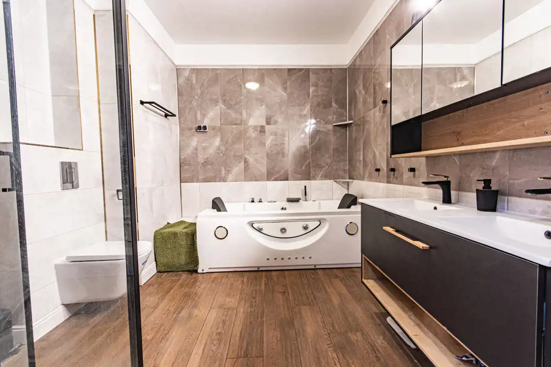 Łazienka została zaprojektowana jako strefa relaksu: wanna z hydromasażem i duży prysznic oraz bateria bidetowa.