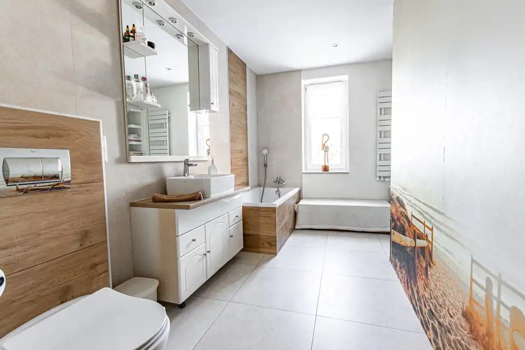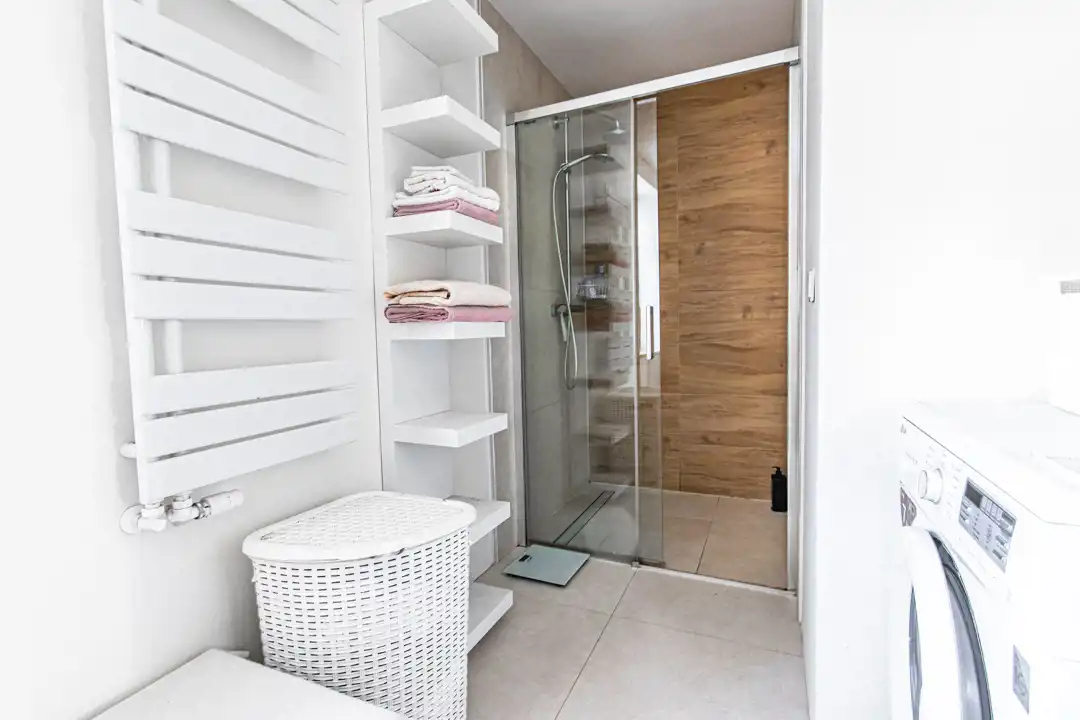 Ciepła woda użytkowa podgrzewana jest z pieca gazowego lub z solarów, co realnie obniża koszty eksploatacji i wpisuje się w ekologiczne podejście.