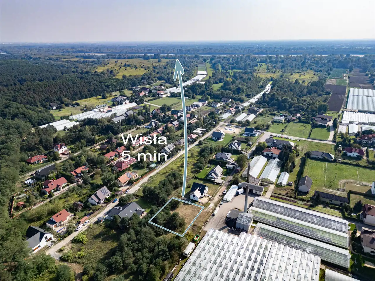 Okolica: Sąsiedztwo to działki zabudowane domami mieszkalnymi, całorocznymi, a także obiekty z usługami nieuciążliwymi tj. szklarnie z warzywami. W bardzo bliskiej okolicy, tj 150 m od działki, znajduje się przedszkole. Znany klub golfowy oddalony jest o około 1,5 km. Nad rzekę Wisłę dojdziemy spacerem w ok 20 min. W okolicy stadnina koni i liczne trasy spacerowo - rowerowe.