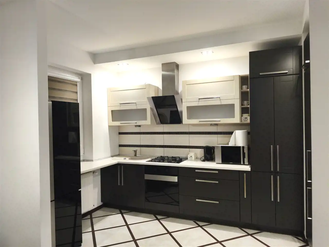 - Kuchnia: meble w zabudowie, lodówka, kuchenka gazowa, piekarnik elektryczny, okap, kuchenka mikrofalowa, czajnik elektryczny, w zabudowie piec gazowy – ogrzewający mieszkanie.